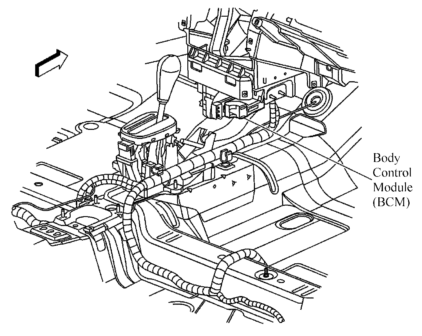 The Body Control Module (BCM) is located on the lower center of the instrument panel, just below the HVAC control assembly.