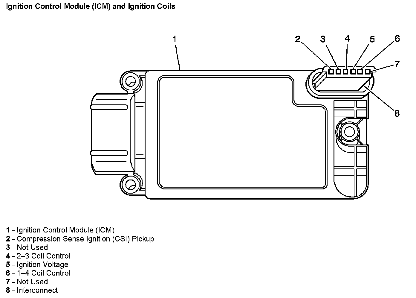 The engine control module (ECM) supplies a signal on each of the ignition control (IC) timing control circuits to the ignition control module (ICM). The ICM fires the correct ignition coil at the correct time based on the signals. The ICM detects if cylinder 1 or cylinder 3 is on the compression stroke by sensing the secondary voltage and polarity of each side of the ignition coil. The ICM detects this voltage with sensing circuitry integrated into each ignition coil. The higher voltage is on the compressing cylinder. This is called compression sense ignition. The ICM provides a synthesized cam signal to the ECM based on these inputs. The ECM uses the cam signal to synchronize fuel injection.