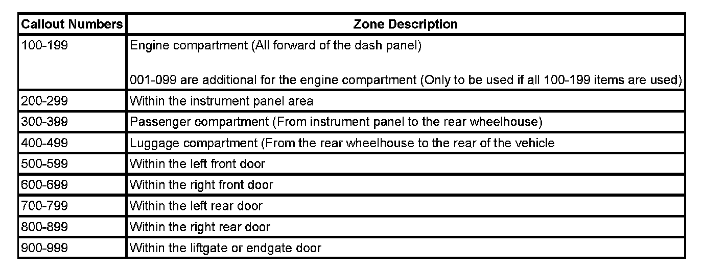 All grounds, in-line connectors, pass-through grommets, and splices have identifying numbers that correspond to where they are located in the vehicle. The table explains the numbering system.