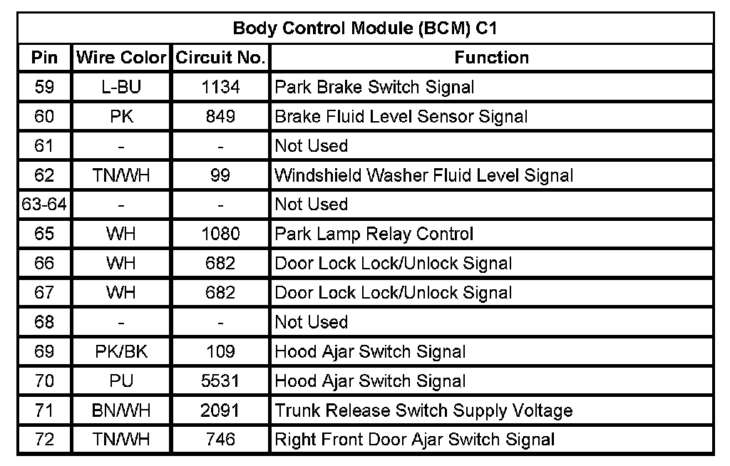 Body Control Module (BCM) C1 (Pin 59 To 72):