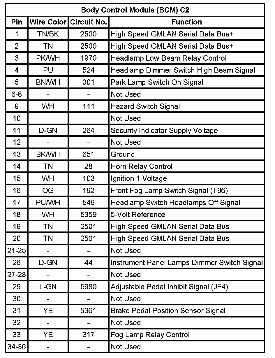 Body Control Module (BCM) C2 (Pin 1 To 36):