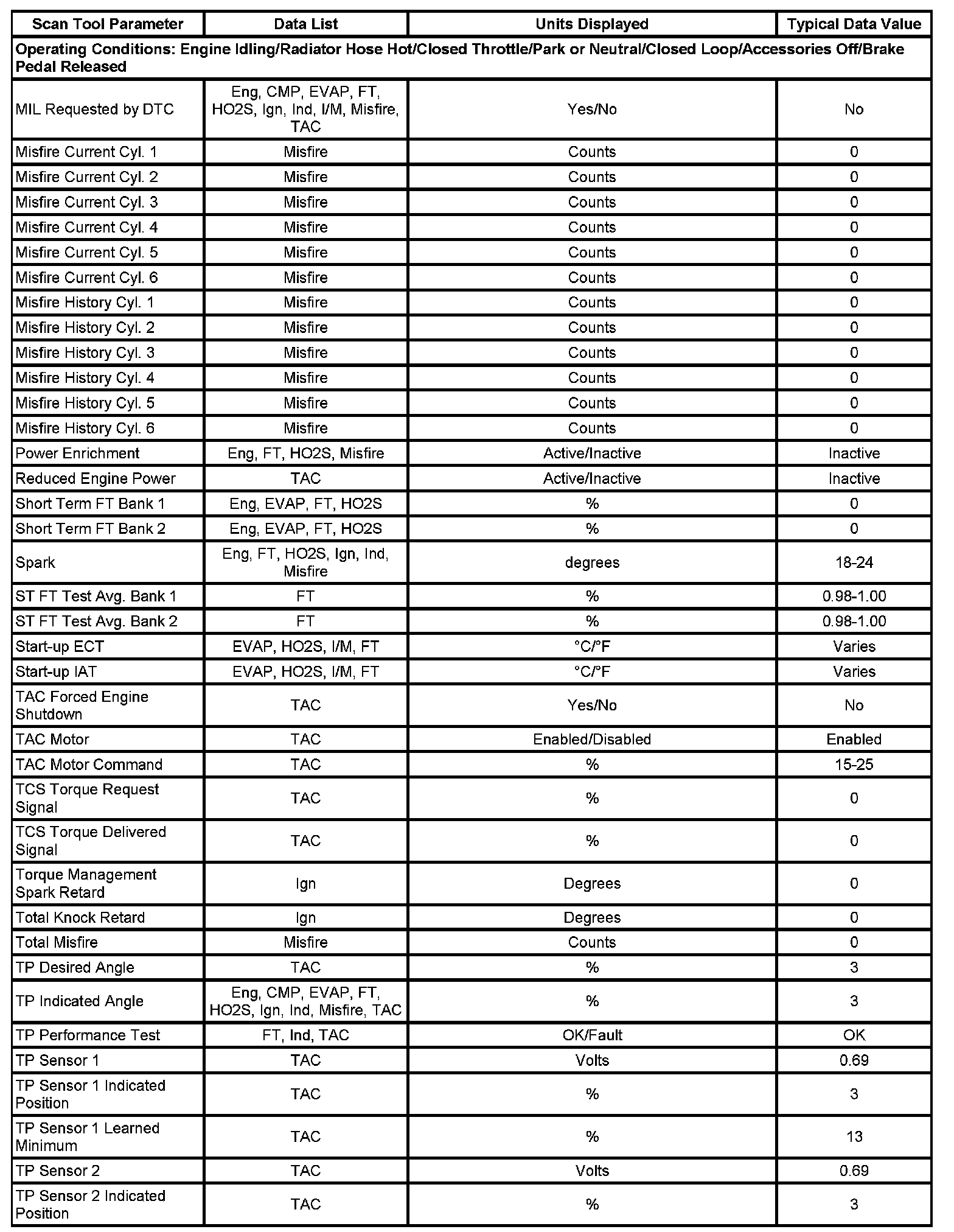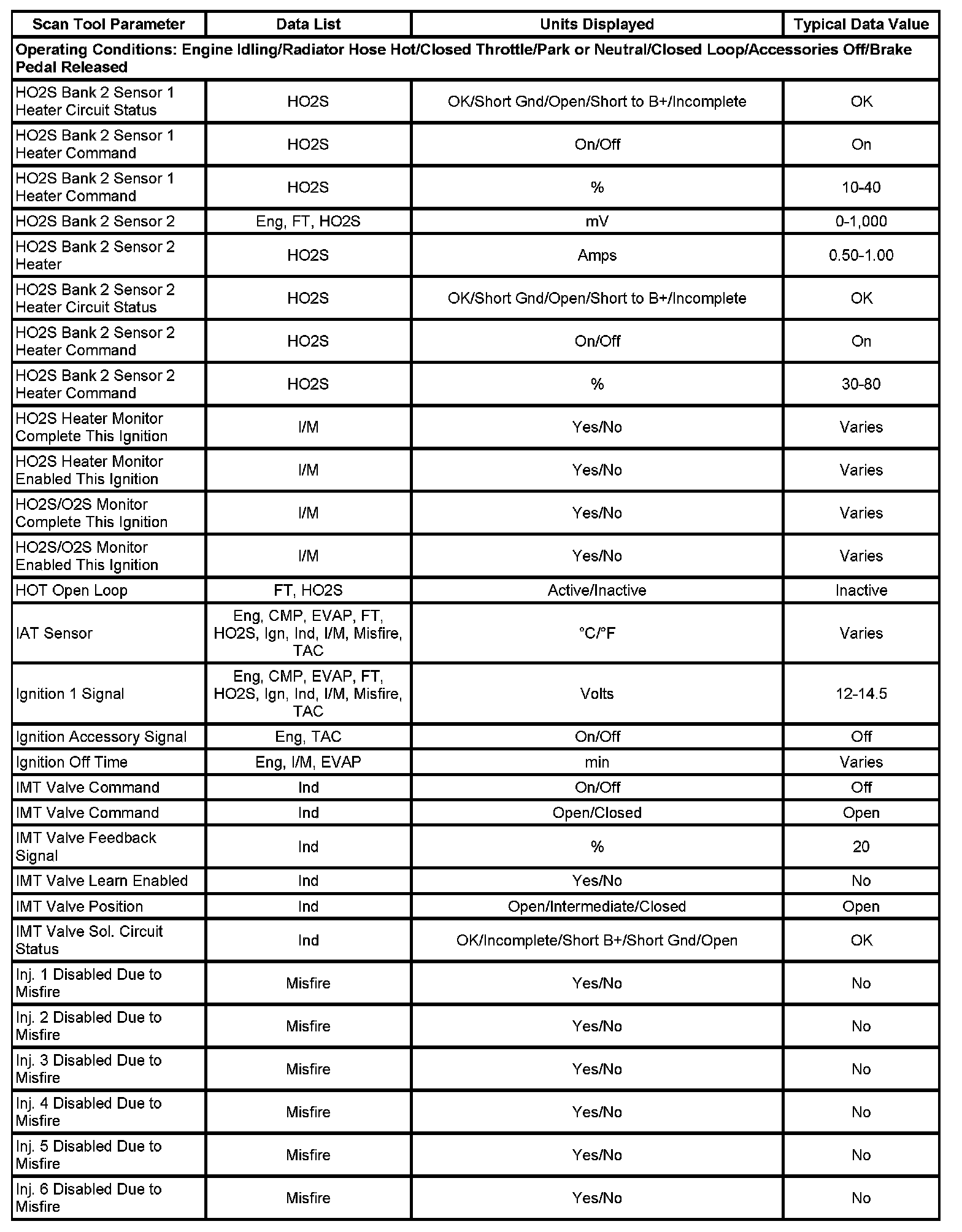 The Engine Scan Tool Data List contains all engine controls-related parameters that are available on the scan tool. The list is arranged in alphabetical order. A given parameter may appear in any one of the data lists, and in some cases may appear more than once, or in more than one data list in order to group certain related parameters together.