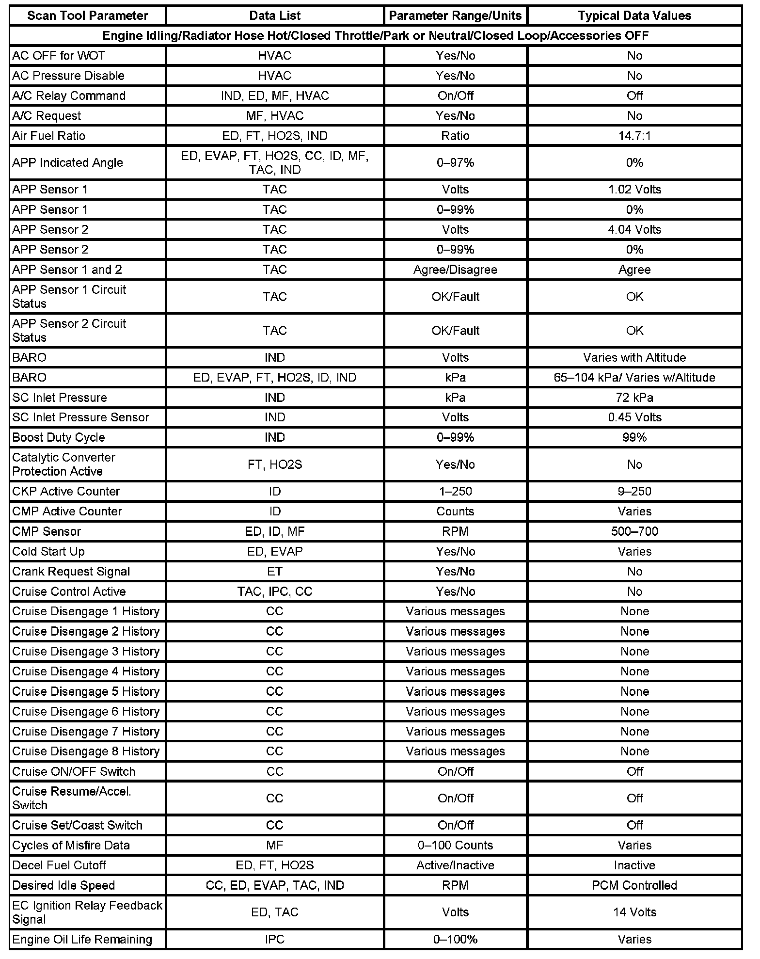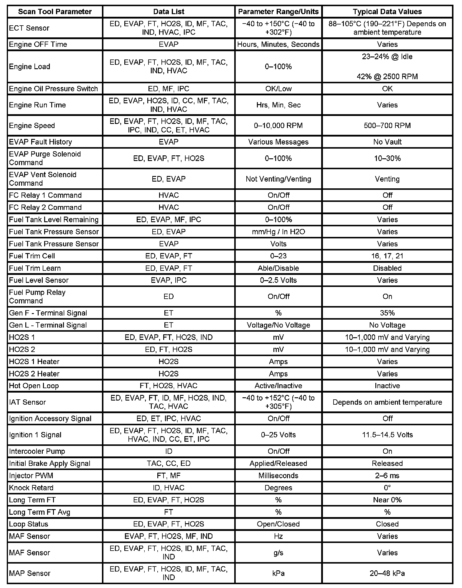 The Engine Scan Tool Data List contains all engine related parameters that are available on the scan tool. The list is arranged in alphabetical order. A given parameter may appear in any one of the data lists, and in some cases may appear more than once, or in more than one data list in order to group certain related parameters together.
