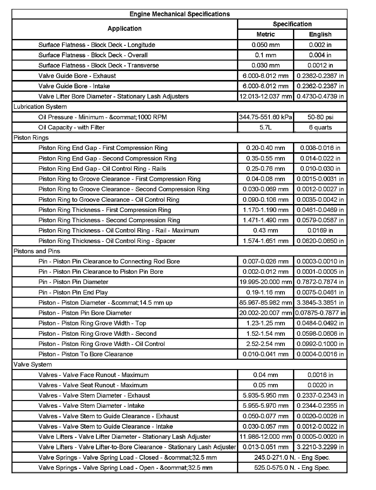 Engine Mechanical Specifications