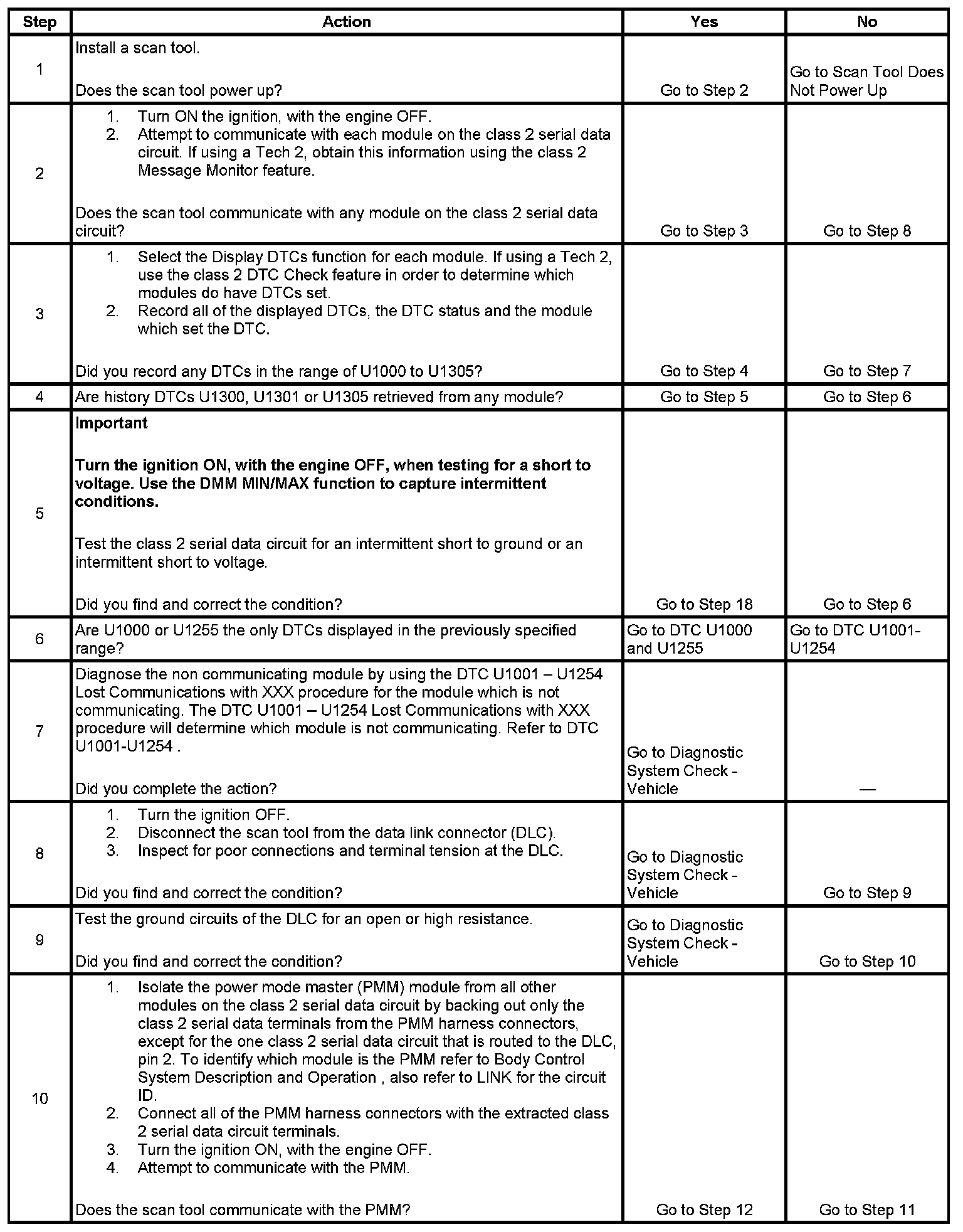 * A class 2 serial data circuit shorted to ground. A history U1300 will set in all modules. Refer to DTC U1300, U1301, or U1305. U1300 U1301 U1305