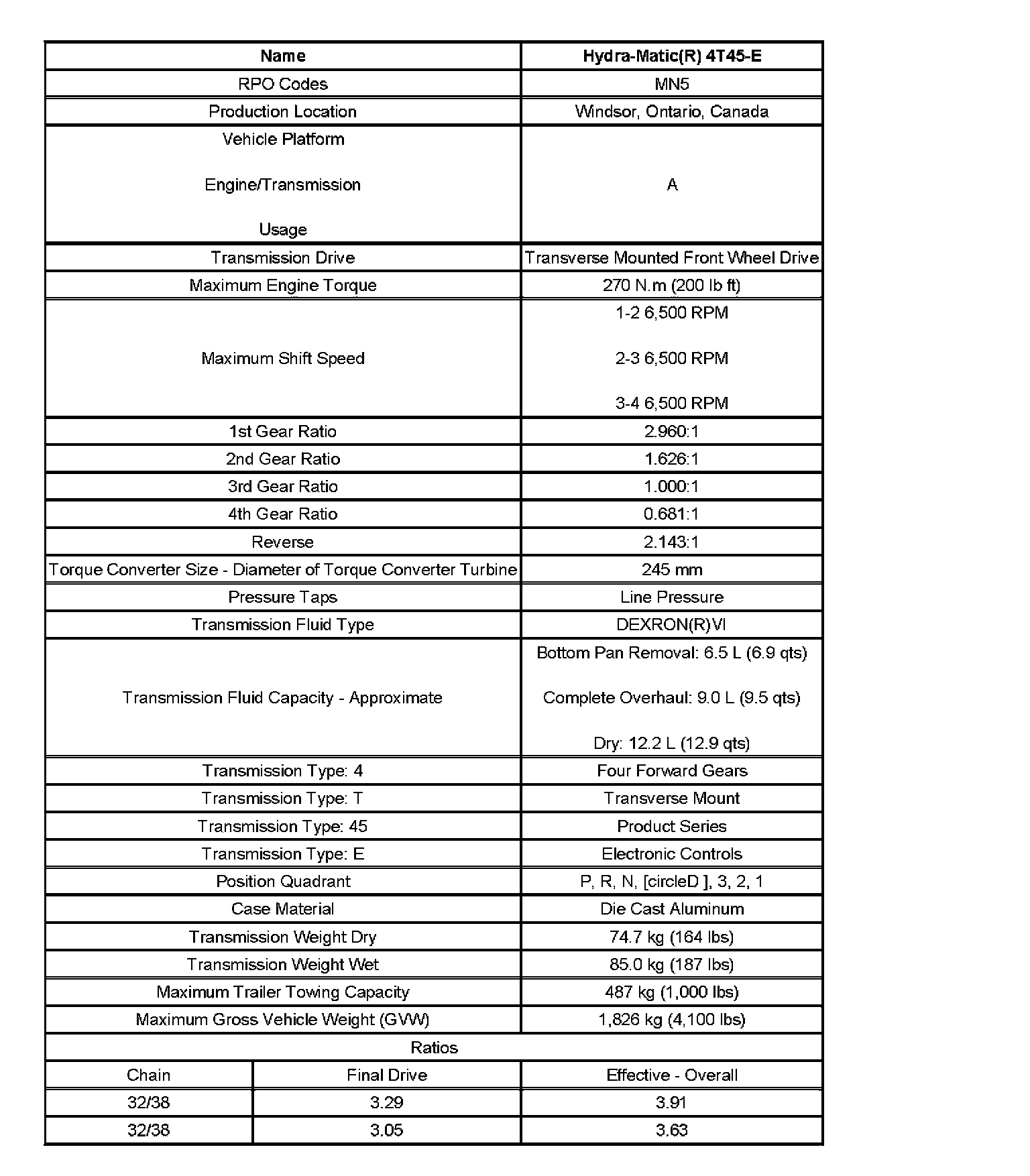 Transmission General Specifications: