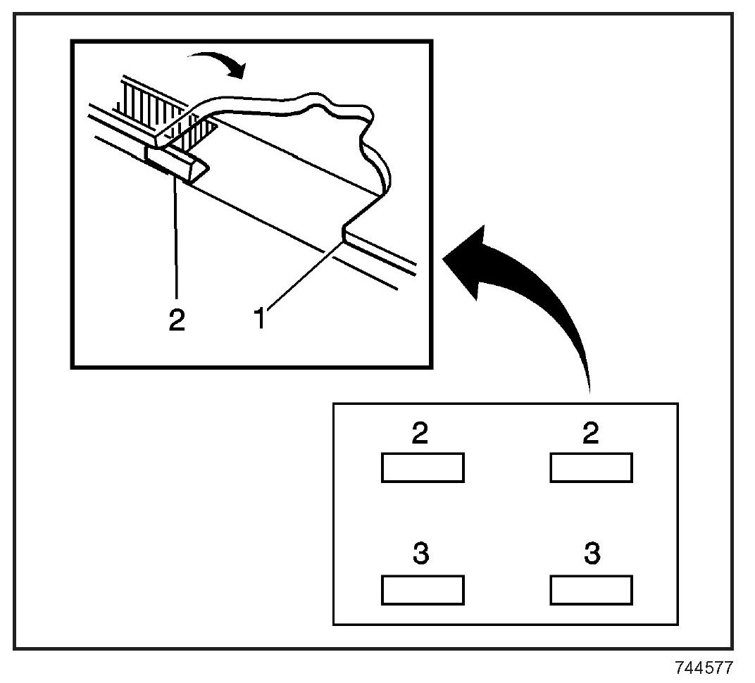 IMPORTANT: Do not apply the black #3 primer to the existing bead (1) of the urethane adhesive on the pinch-weld flange. Apply the primer only to nicks, scratches or the primed surfaces.