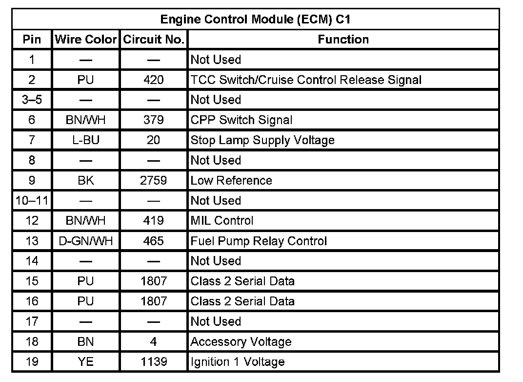 Engine Control Module (ECM) C1 (Pin 1 To 19):