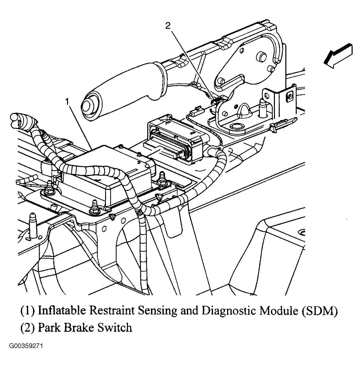 | Inflatable Restraint Sensing & Diagnostic Module (SDM) | Under center console, behind emergency brake. See Figure. |