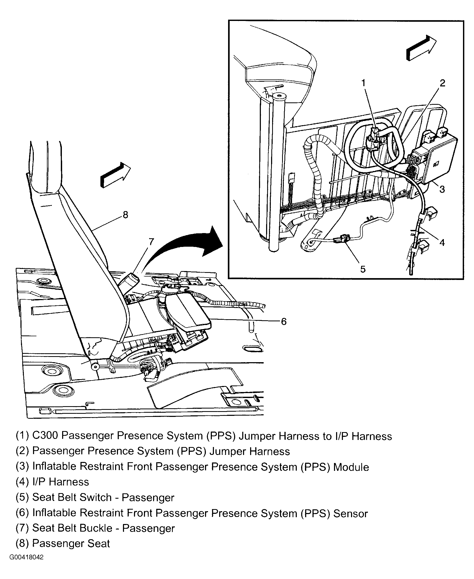 | Inflatable Restraint Front Passenger Presence System (PPS) Module | Under front passenger's seat. See Figure. |