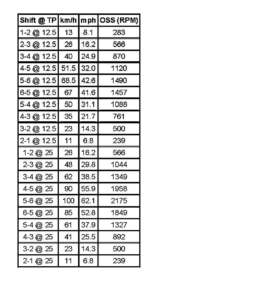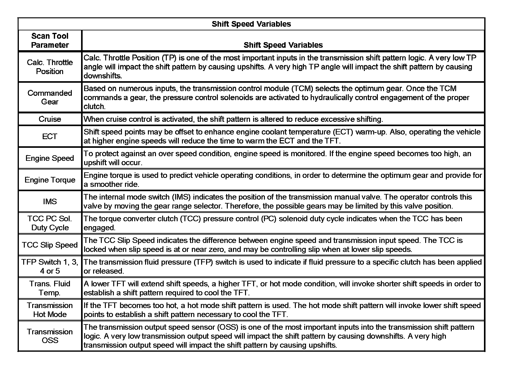 Important: Shift speed points are affected by many different vehicle and transmission operating conditions. The table above represents shift speed points calibrated at specific throttle angles during normal operating conditions and a temperature range between 0-130°C (32-266°F). These shift speed points are also based on an effective final drive ratio of 3.16, and assume a production-intent tire size. The table below illustrates a number of different variables that influence these shift speed points. Based on a given operating condition, these variables may override the normal shift speed points. To assist in monitoring the different variables, the respective scan tool data parameter is also listed.