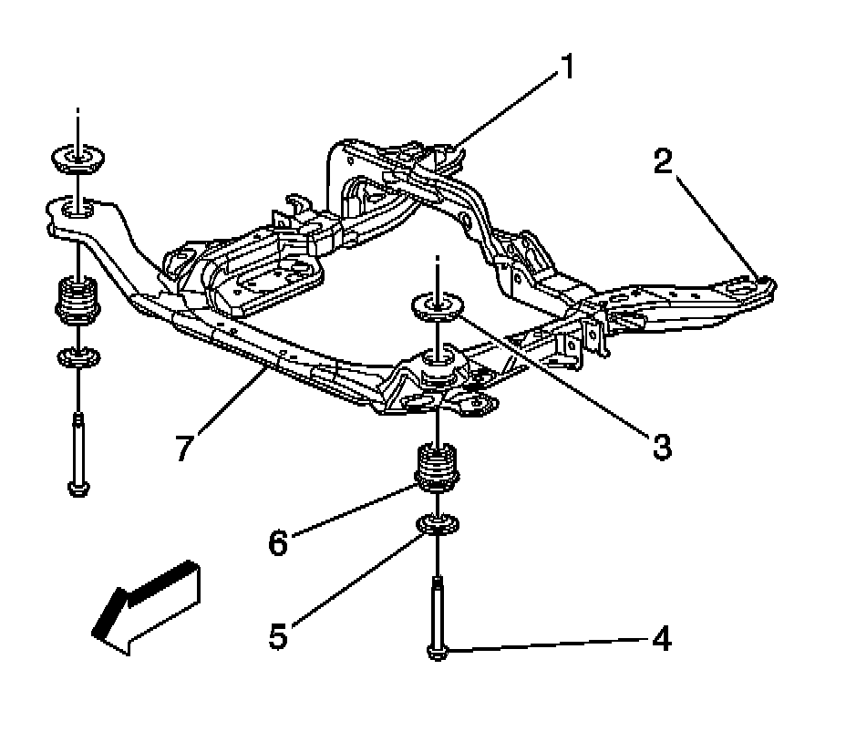 Important:In order to remove any frame insulator, loosen the adjacent frame insulators to permit the frame to separate from the body. Do not break the fan shroud or damage the frame attachments, such as steering hoses and brake pipes during the replacement of body mounts. When installing a body mount, ensure the lower insulator is seated into the frame. The lower insulator should not be loose. The spacer and the corresponding upper insulator is pressed into the lower insulator thus squeezing the frame. The bolt is then inserted through the mount, capturing the lower retainer. The body mount components prevent contact of the frame to the body. Do not over tighten the body mount. Over tightening may collapse a spacer or strip a bolt. When the frame insulator bolts are removed, always discard the bolts and replace with new bolts. When clamping by the mount, ensure the surfaces are clean and dry. If the frame insulator bolt does not screw in smoothly, run a tap through the frame crossmember nut in the body in order to remove foreign material. Ensure the tap does not punch through the underbody. Whenever the body is moved in relation to the frame, disconnect the intermediate shaft from the rack and pinion steering gear and stub shaft.