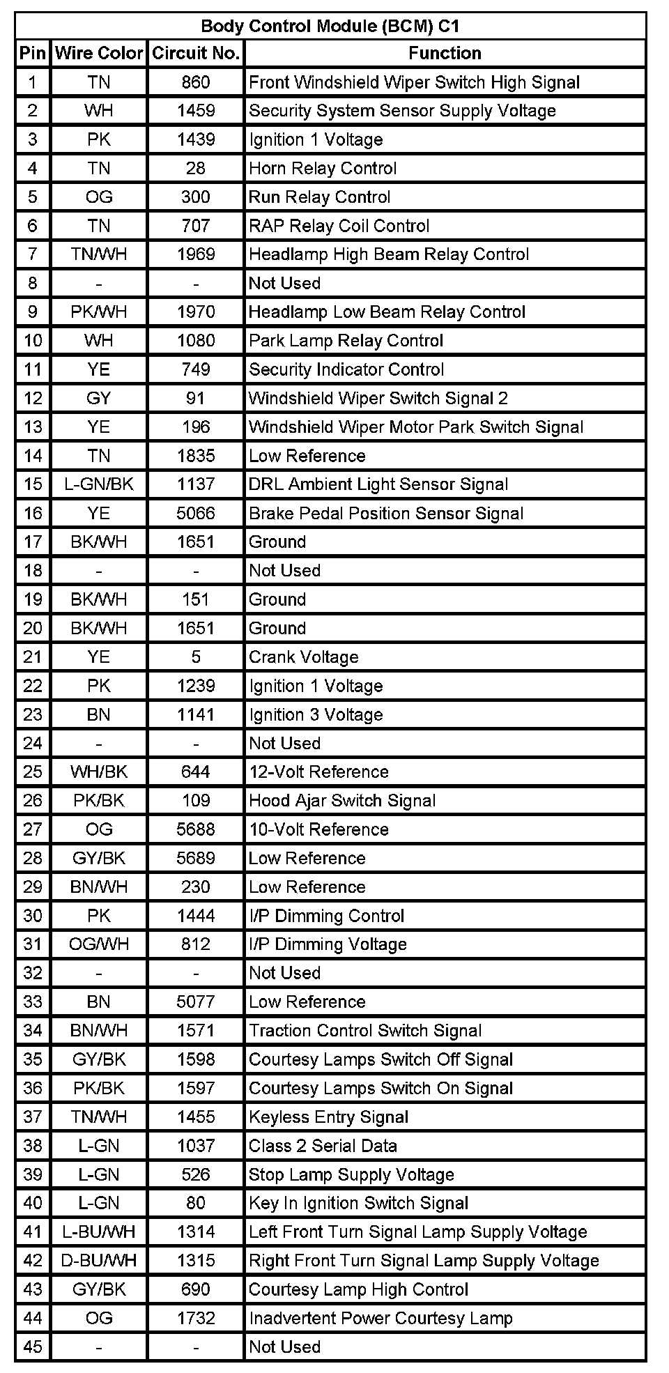 Body Control Module (BCM) C1 (Pin 1 To 45):
