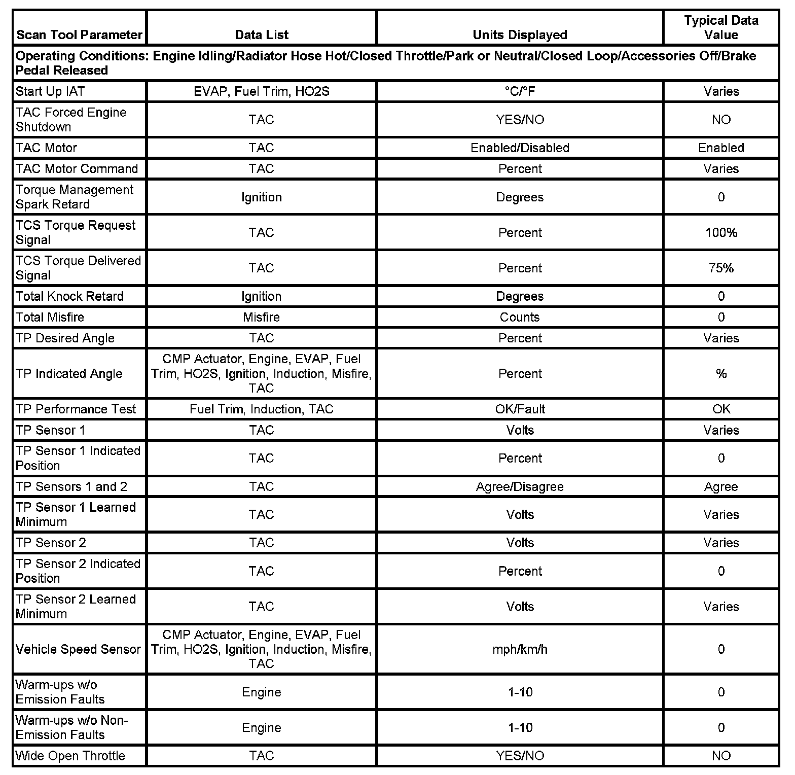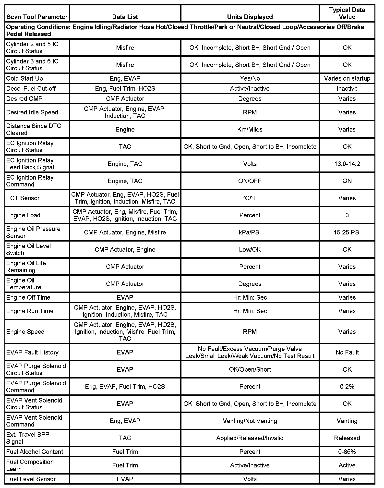 The scan tool values from a properly running engine may be used for comparison with the engine you are diagnosing. The Engine Scan Tool Data List represents values that would be seen on a normally running engine.