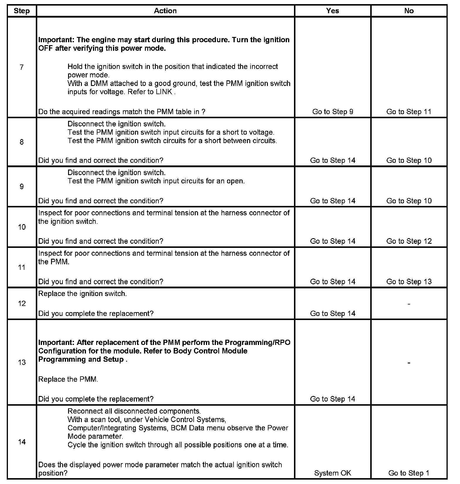Normal vehicle serial data communications and the control modules operations will not begin until the system power mode has been identified. Discrete wires from the ignition switch contacts are monitored by a module which acts as the power mode master (PMM) in order to determine the correct power mode. The module which is the PMM communicates the system power mode to all modules on the serial data lines. Refer to LINK to identify which module is the PMM and the applicable power mode look up table.