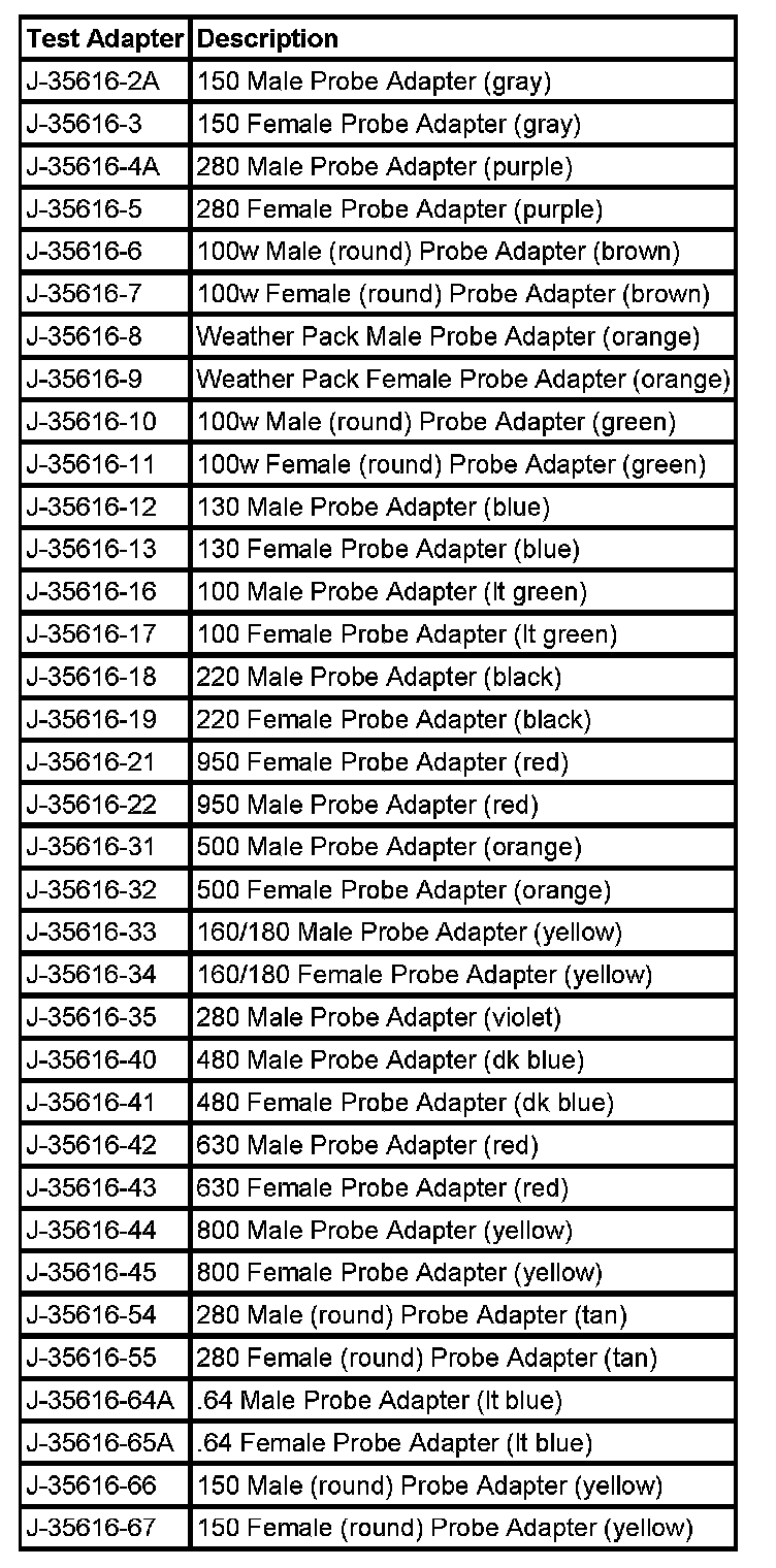 When using the J35616 GM-Approved Terminal Test Kit, ensure the terminal test adapter choice is the correct size for the connector terminal. Do not visually choose the terminal test adapter because some connector terminal cavities may appear larger than the actual terminal in the cavity. Using a larger terminal test adapter will damage the terminal. Refer to the J35616 GM-Approved Terminal Test Kit label on the inside of the J35616 GM-Approved Terminal Test Kit for the correct adapter along with the connector end view for terminal size. Refer to the following table as guide in selecting the correct test adapter for frontprobing connectors: