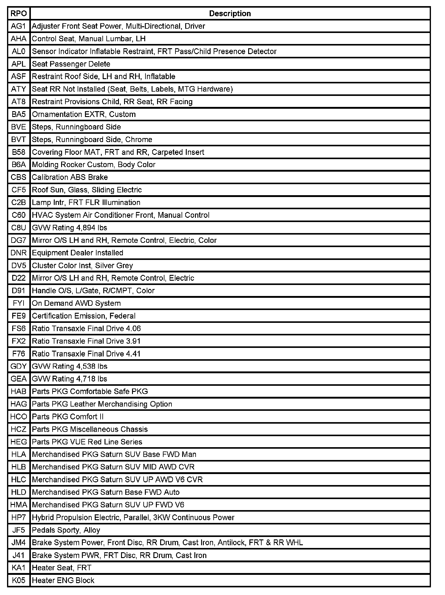 RPO Code List