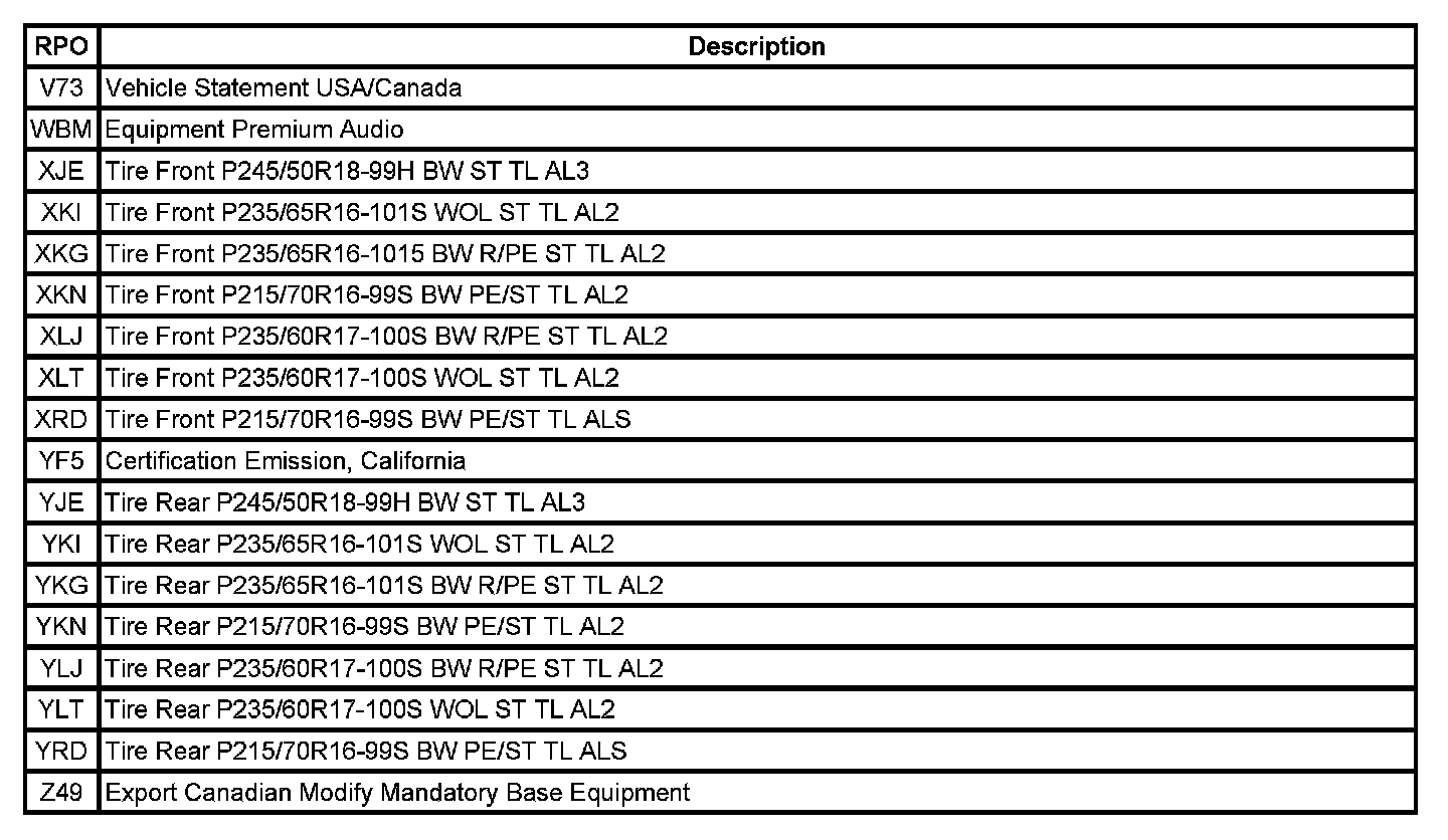 The following table provides the description of the RPO codes that are available on the vehicle. The vehicles RPO list is printed on the Service Parts Identification Label.