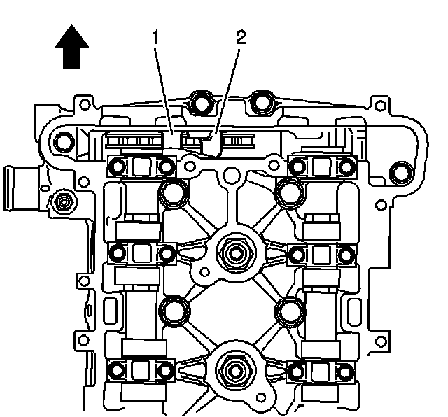 ^ Lower the timing chain through the opening in the cylinder head. Use care to ensure that the chain goes around both sides of the cylinder block bosses (1, 2).