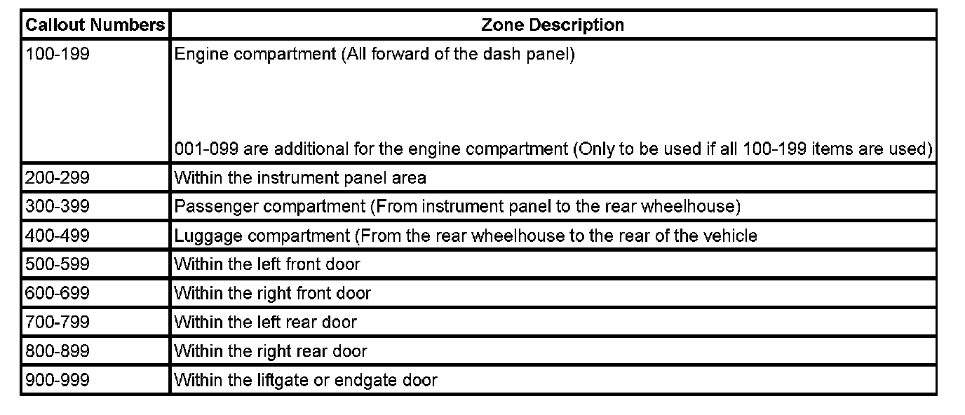 All grounds, in-line connectors, pass-through grommets, and splices have identifying numbers that correspond to where they are located in the vehicle. The following table explains the numbering system.