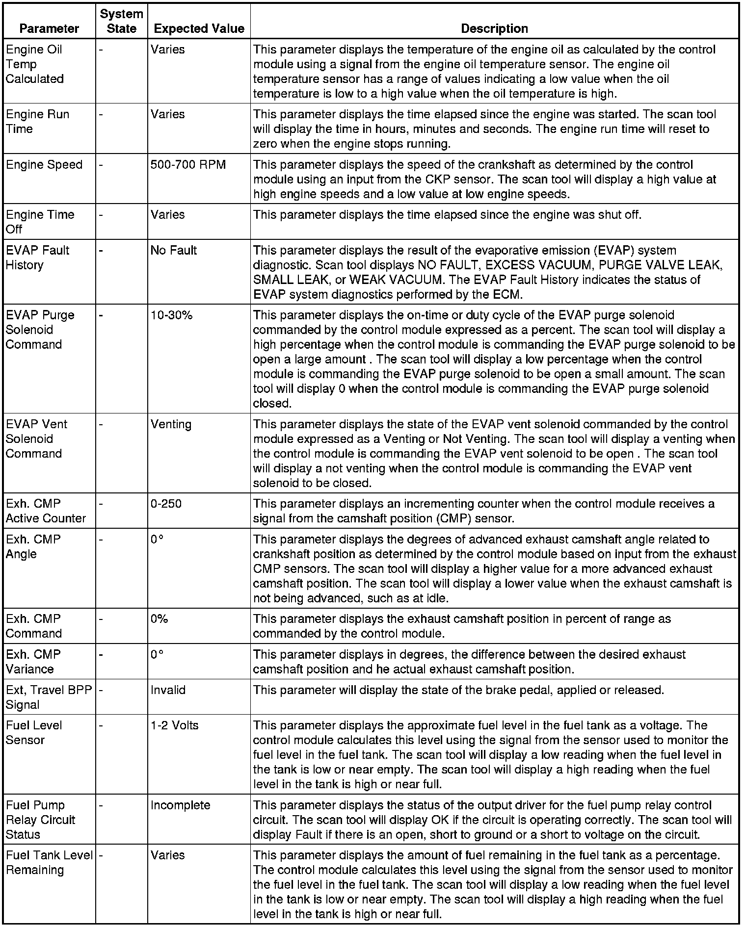 The Engine Scan Tool Data List contains all engine related parameters that are available on the scan tool. The list is arranged in alphabetical order.