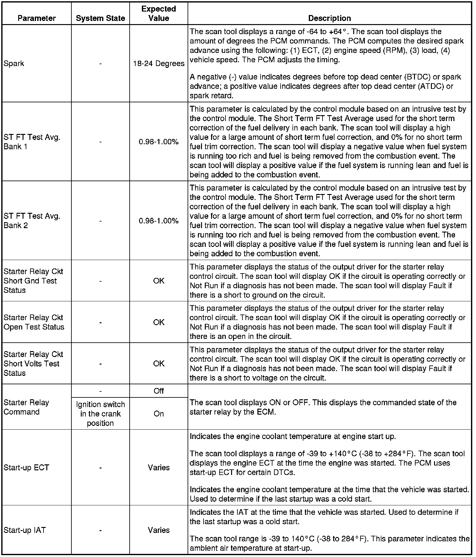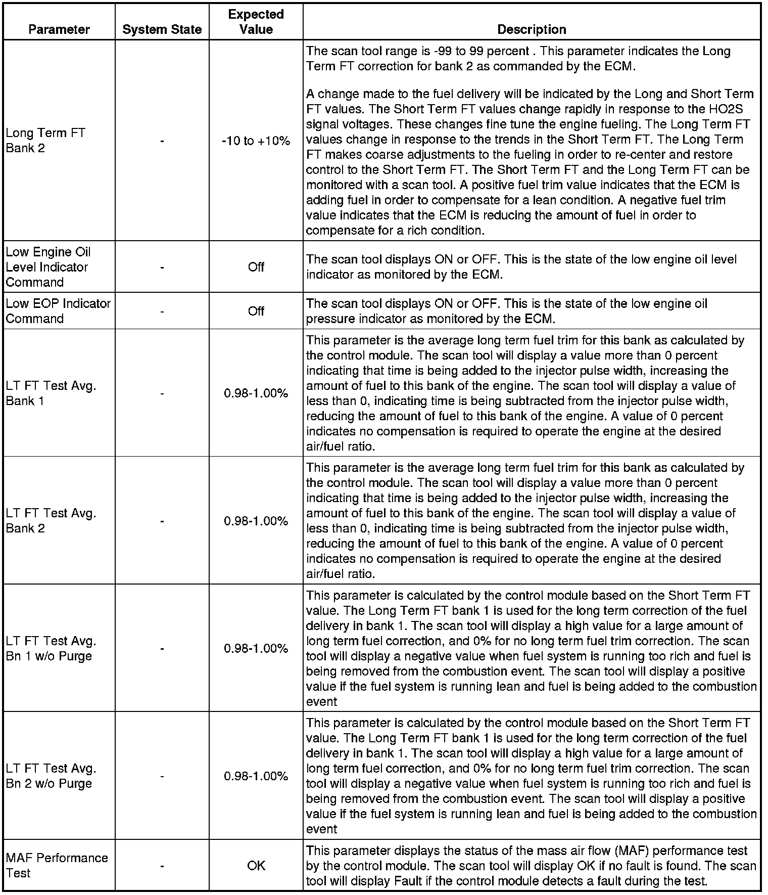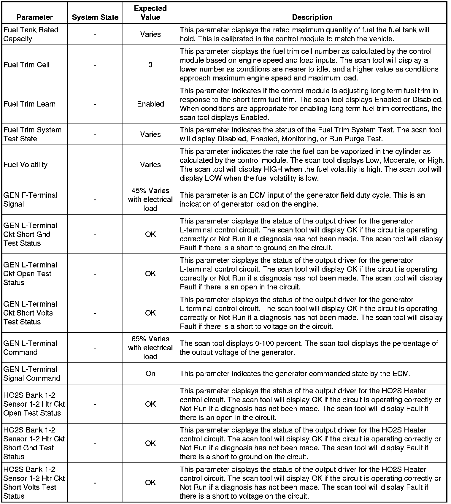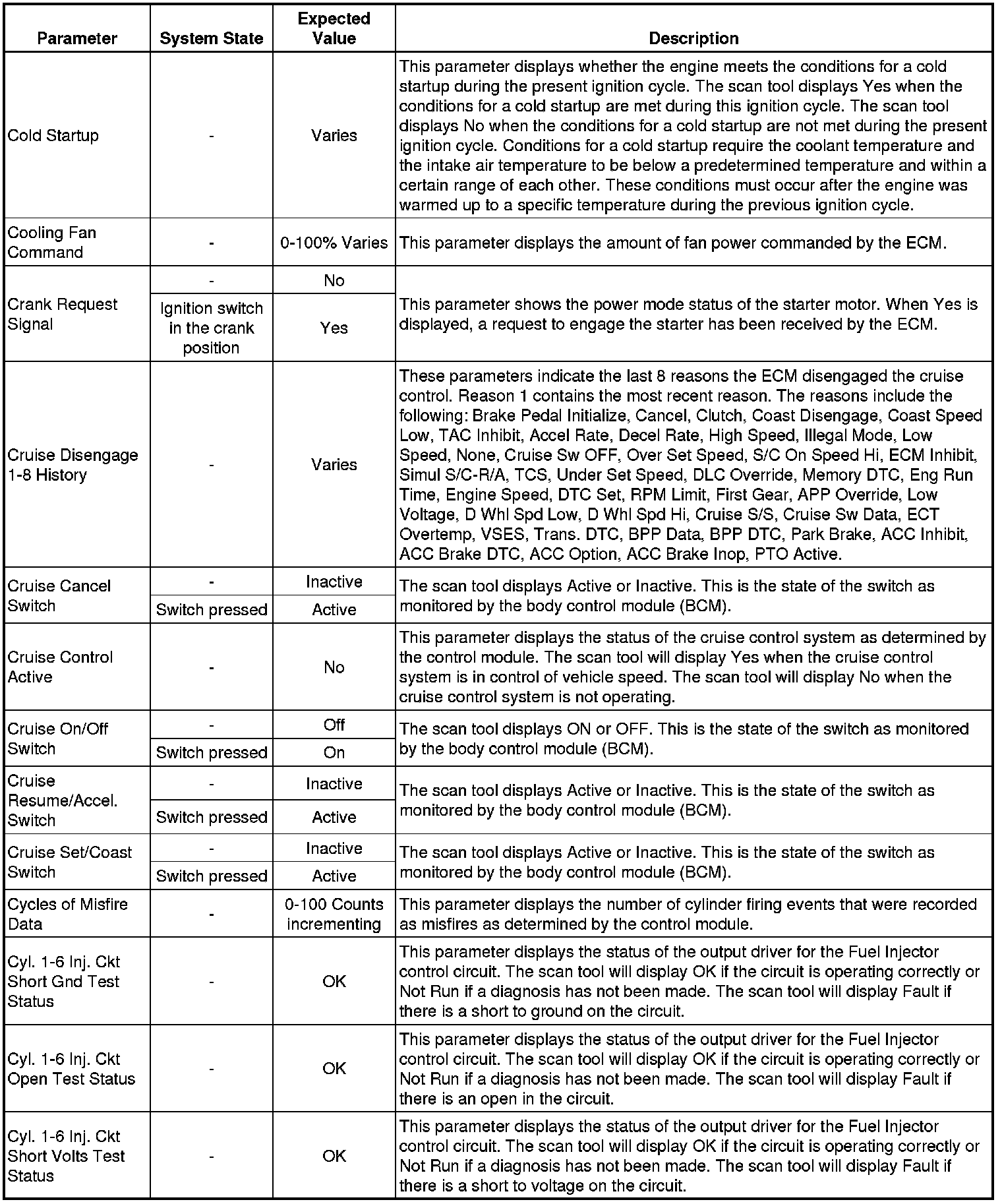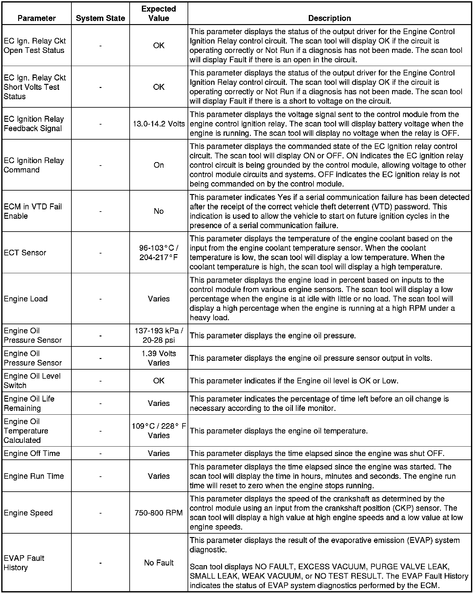 The Engine Control Module Scan Tool Data List contains all engine-related parameters that are available on the scan tool. The list is arranged in alphabetical order. A given parameter may appear in any one of the data lists, and in some cases may appear more than once, or in more than one data list in order to group certain related parameters together.