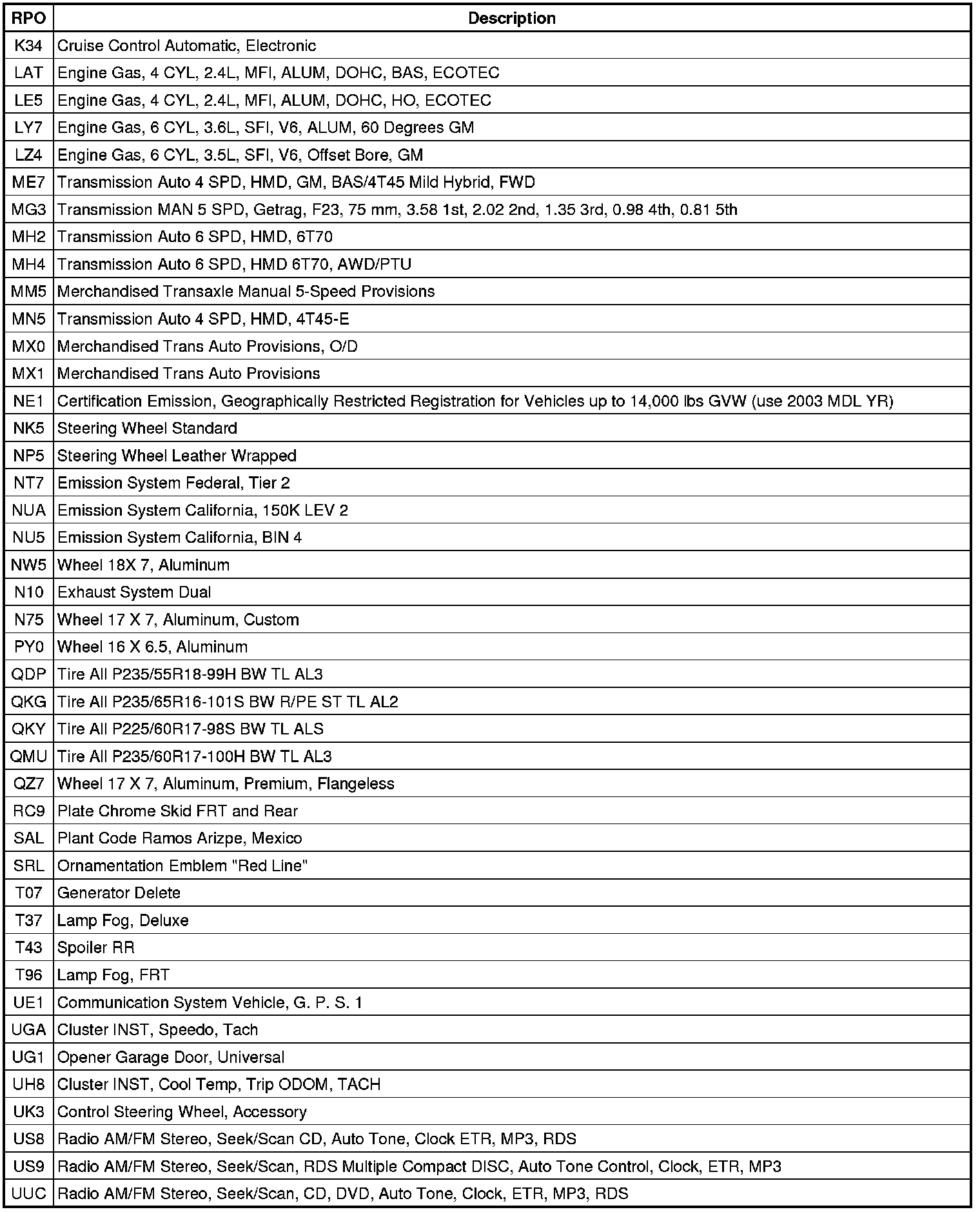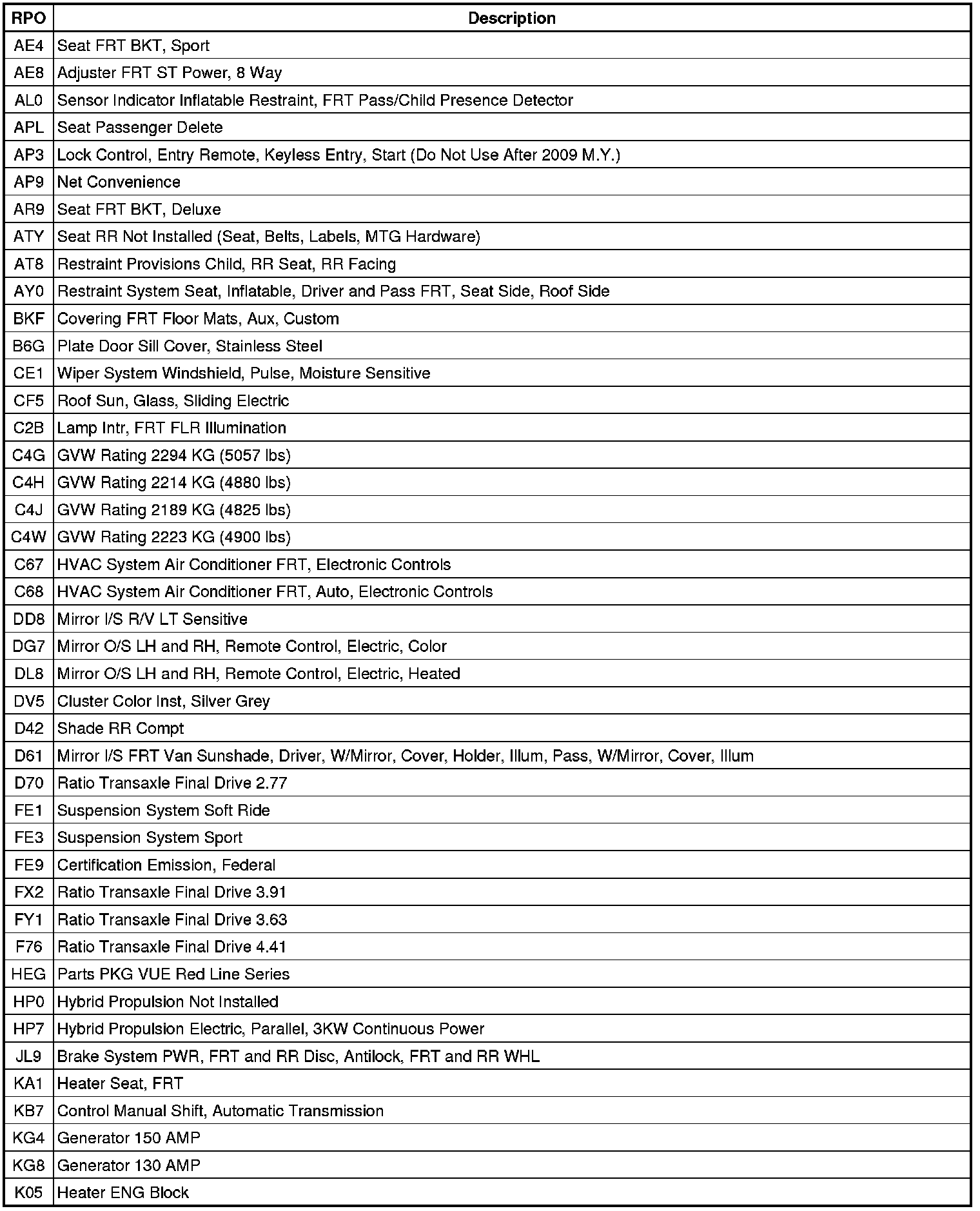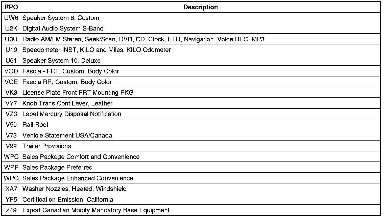 The following table provides the description of the RPO codes that are available on the vehicle. The vehicles RPO list is printed on the Service Parts Identification Label.