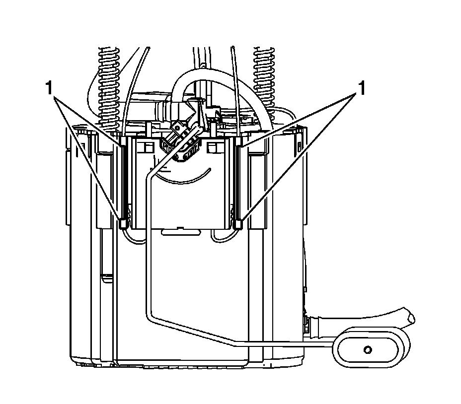 3. Remove the fuel level sensor wiring from behind the retaining features (1) molded into the fuel tank fuel pump module reservoir.