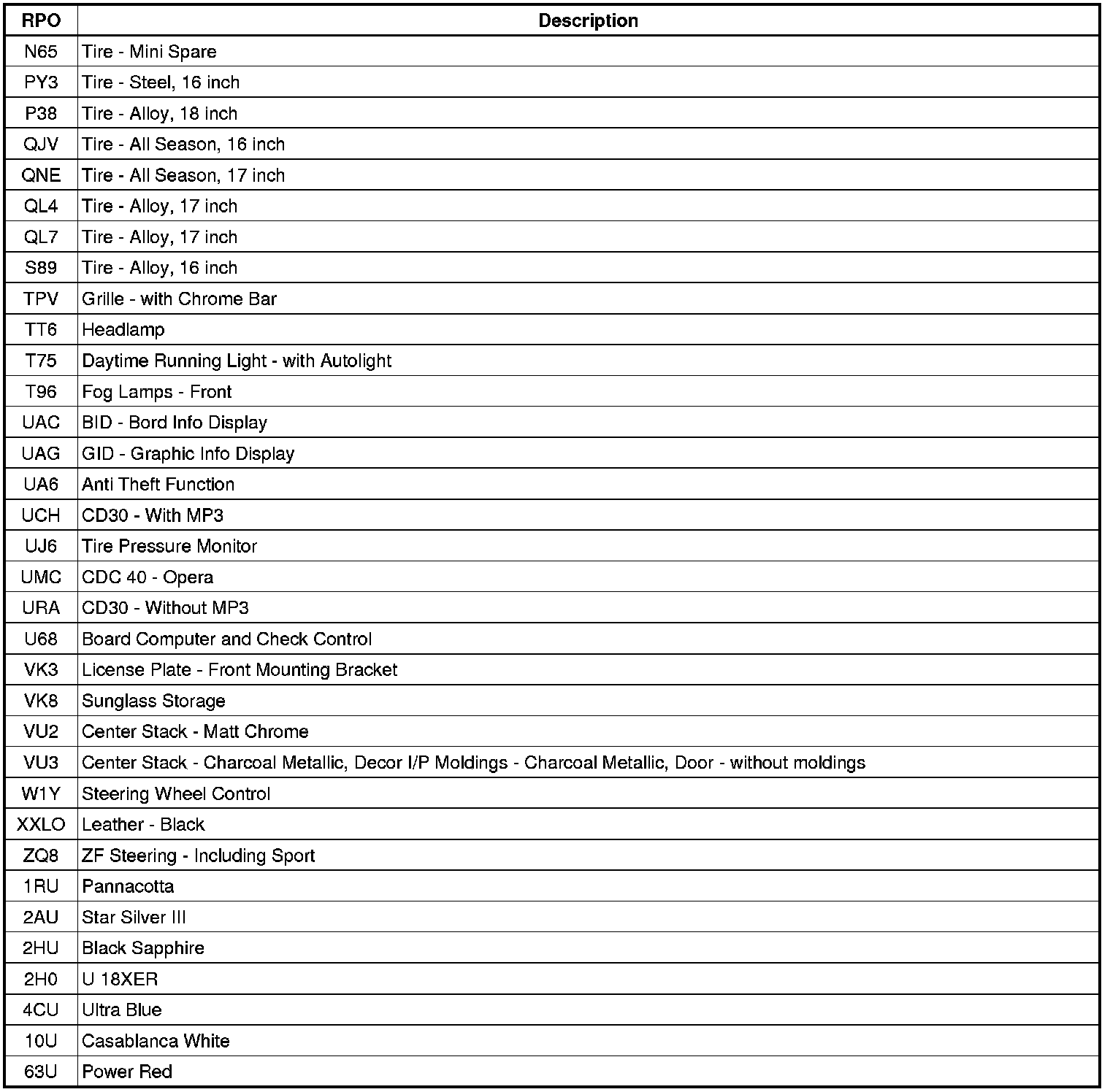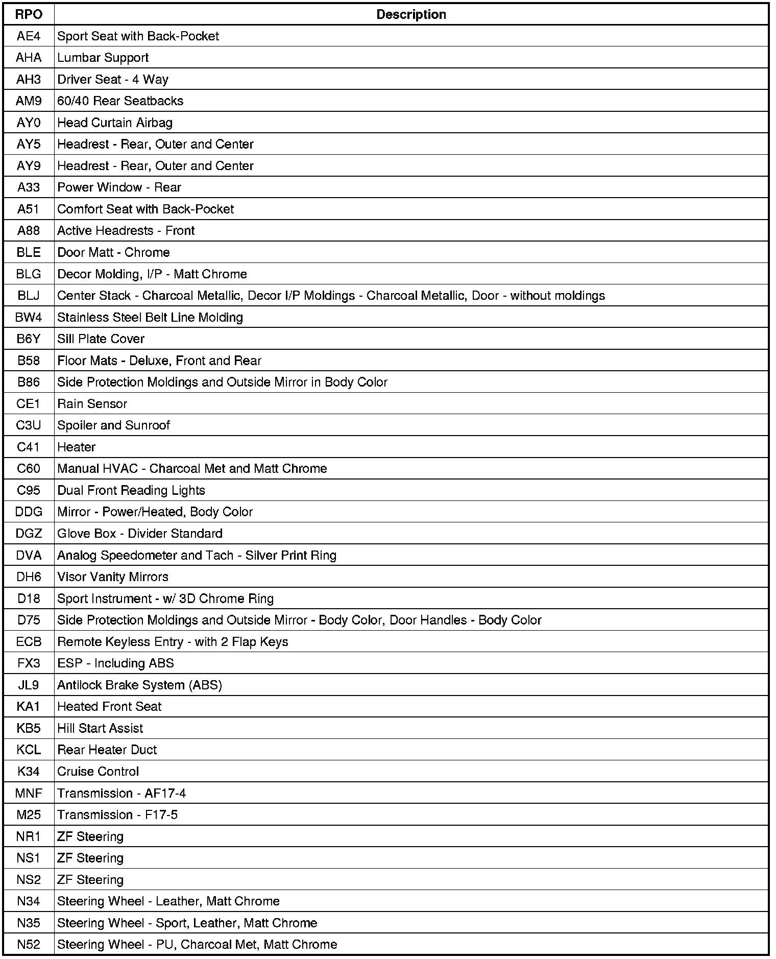 RPO Code List