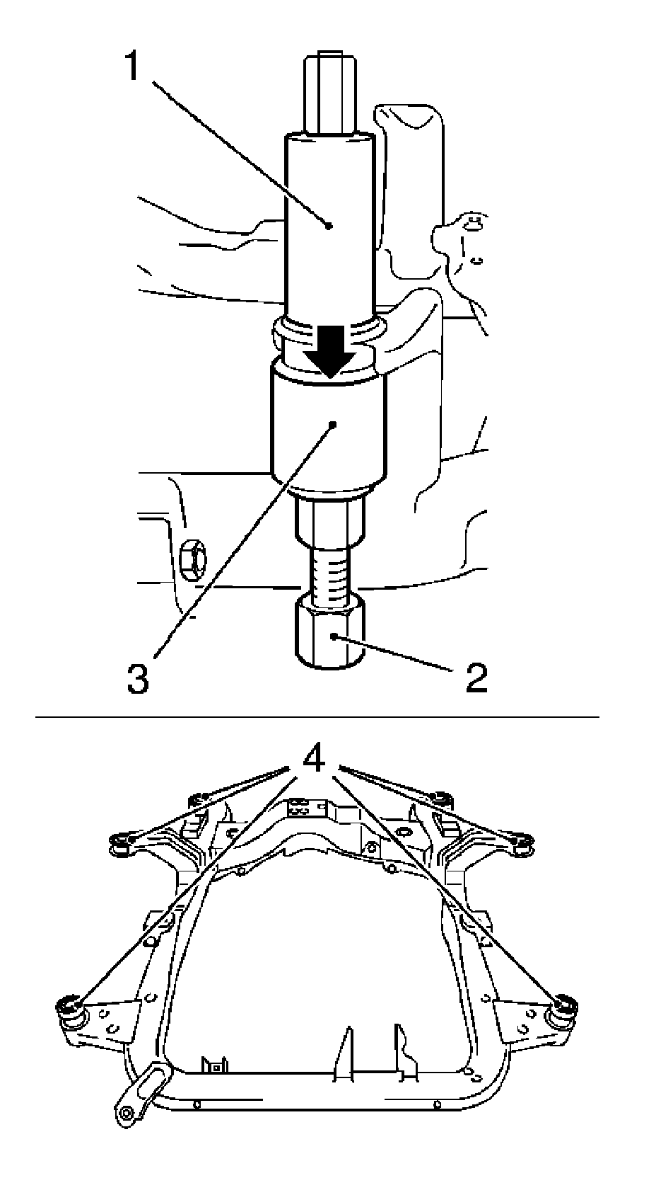 2.Press the corresponding damping bushing (4) out of the front frame with the KM-907-11 (3), KM-907-12 (1) and KM-907-30 (2).