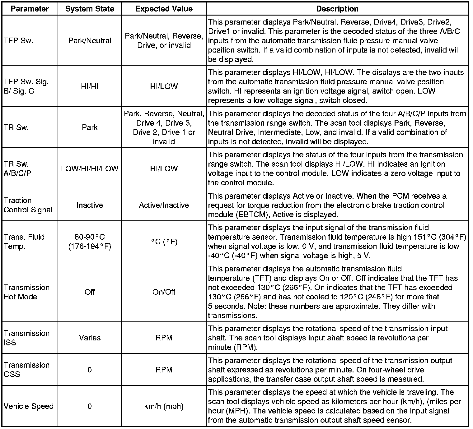 The Transmission Control Module Scan Tool Data List contains all transmission related parameters that are available on the scan tool. The list is arranged in alphabetical order. A given parameter may appear in any one of the data lists, and in some cases may appear more than once, or in more than one data list in order to group certain related parameters together.
