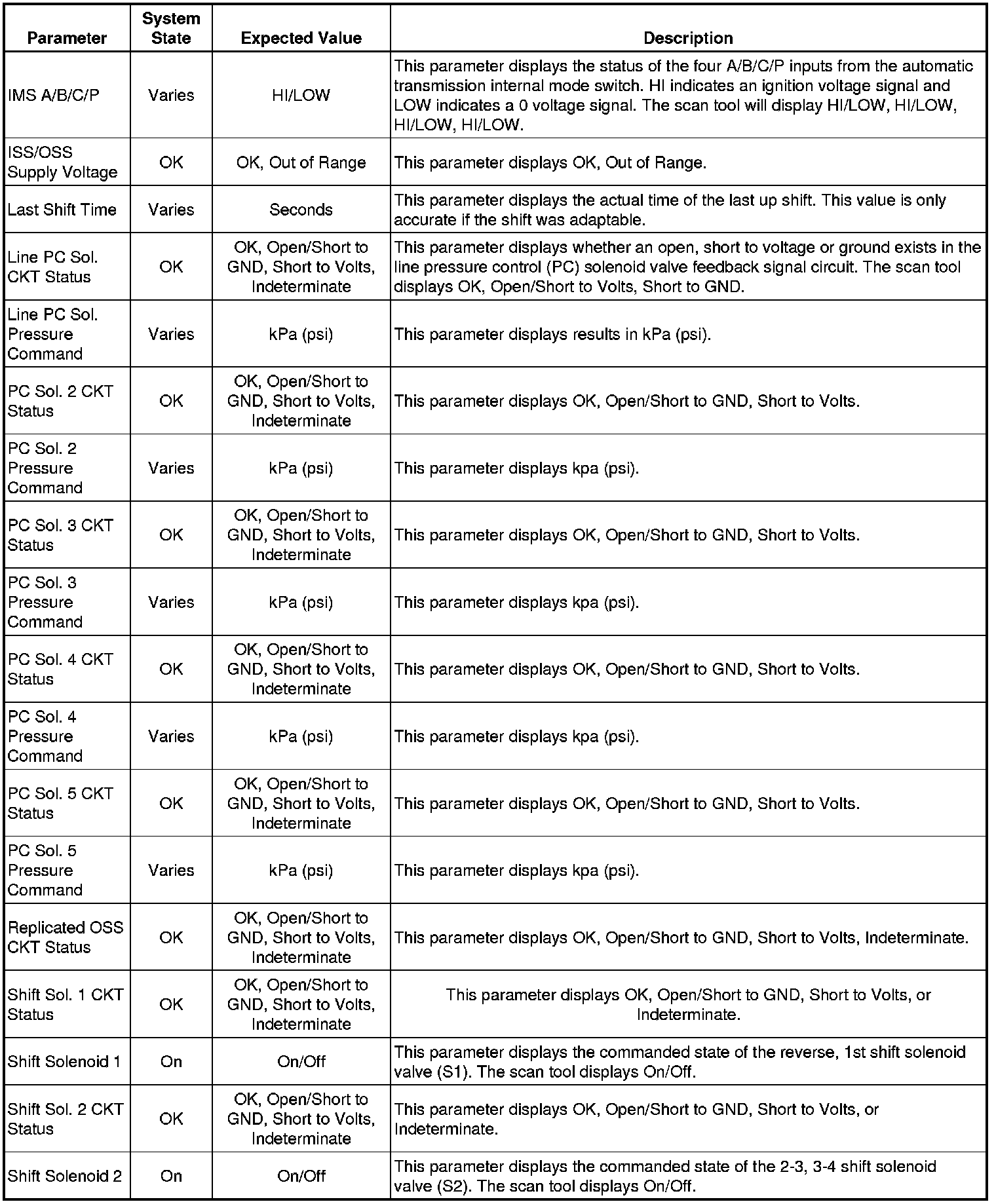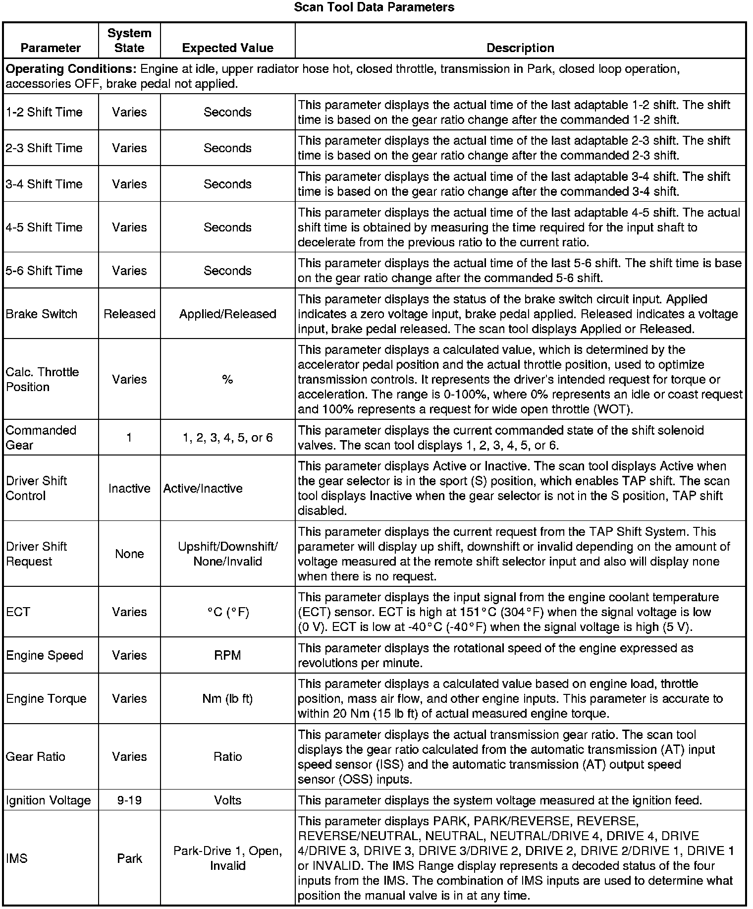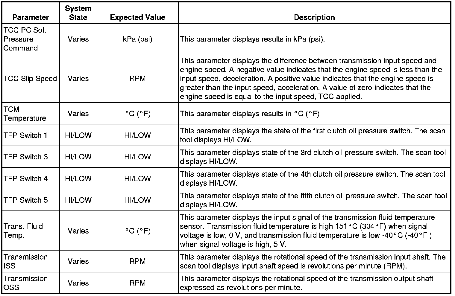 The Transmission Control Module Scan Tool Data List contains all transmission related parameters that are available on the scan tool. The list is arranged in alphabetical order. A given parameter may appear in any one of the data lists, and in some cases may appear more than once, or in more than one data list in order to group certain related parameters together.