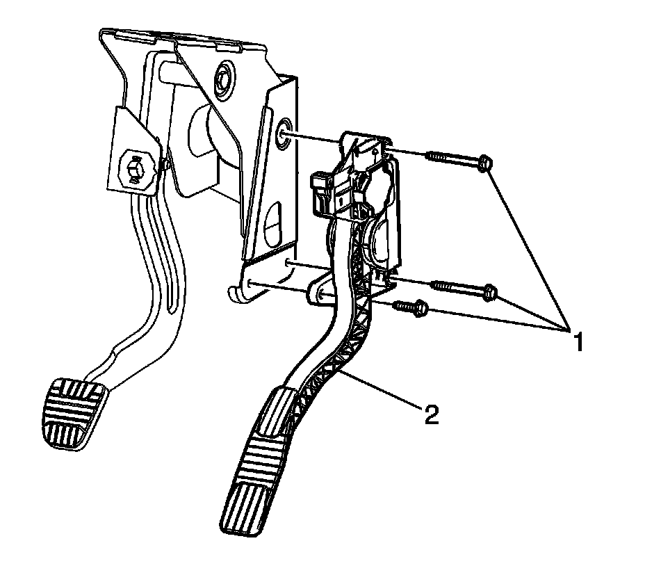 2. Disconnect the instrument panel wiring harness electrical connector (2) from the accelerator pedal position (APP) sensor (1).