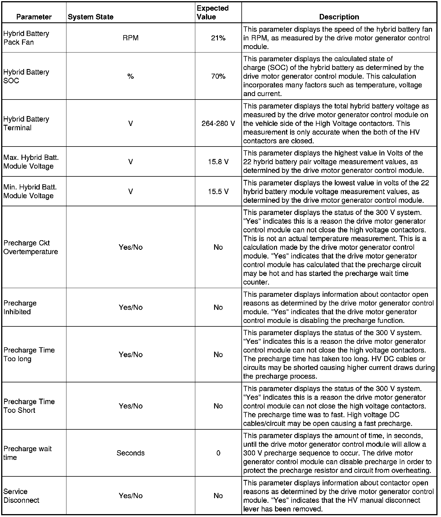 The Drive Motor Generator Battery Control Module Scan Tool Data List contains all Hybrid Battery related parameters that are available on the scan tool. The list is arranged in alphabetical order. A given parameter may appear in any one of the data lists, and in some cases may appear more than once, or in more than one data list in order to group certain related parameters together.