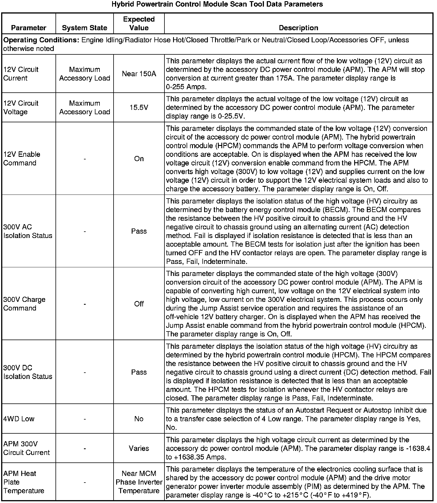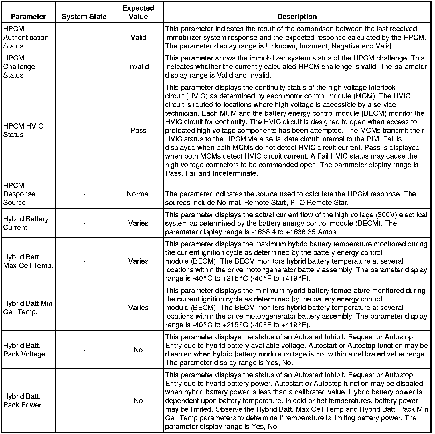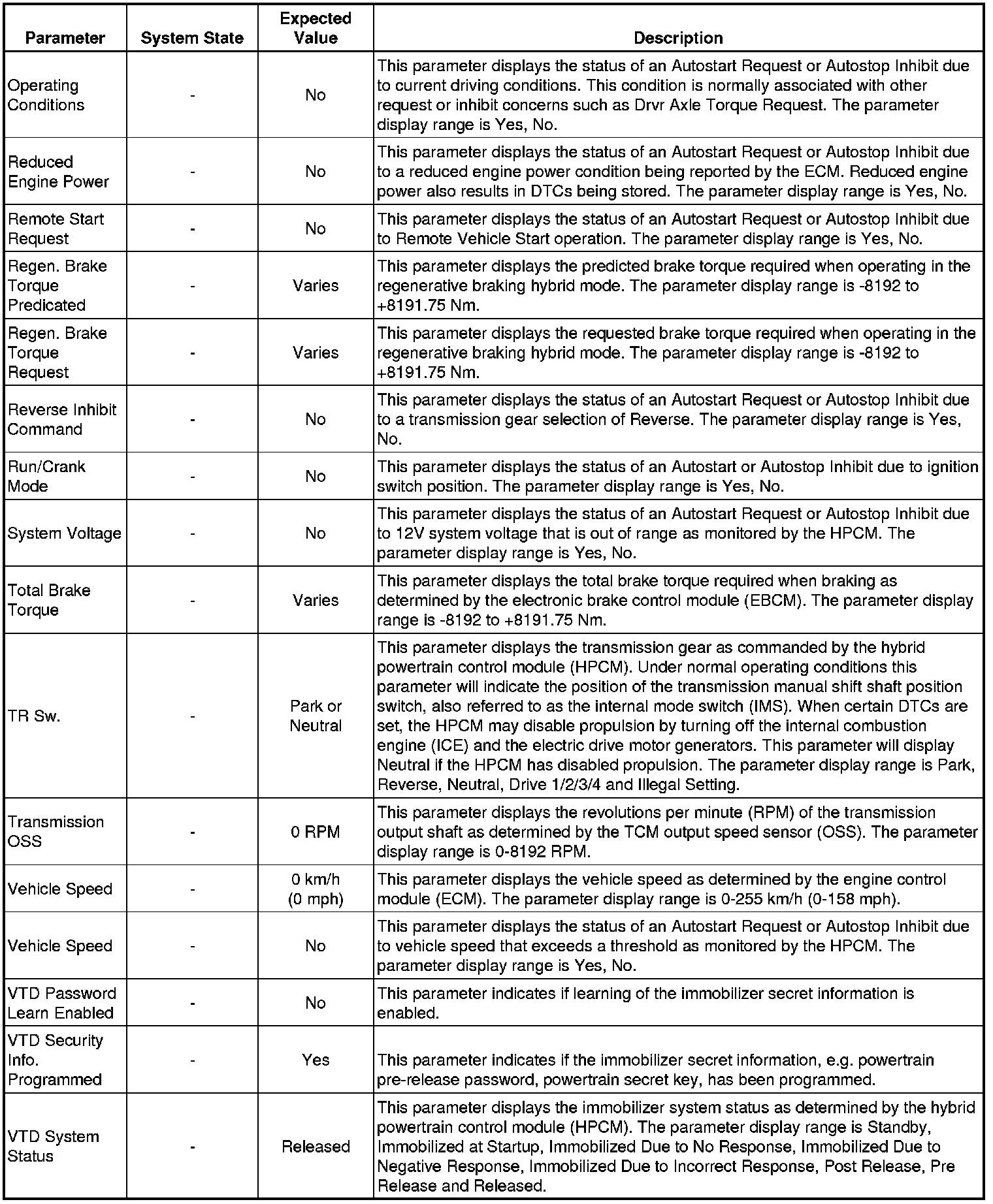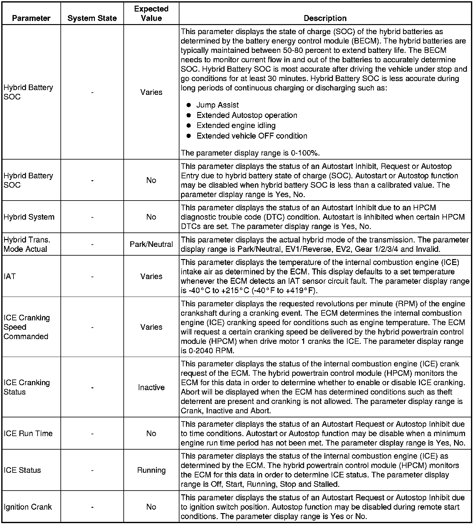 The scan tool values from a properly running vehicle may be used for comparison with the vehicle you are diagnosing. The Hybrid Powertrain Control Module Scan Tool Data Parameters list represents values that would be seen on a normally running vehicle.