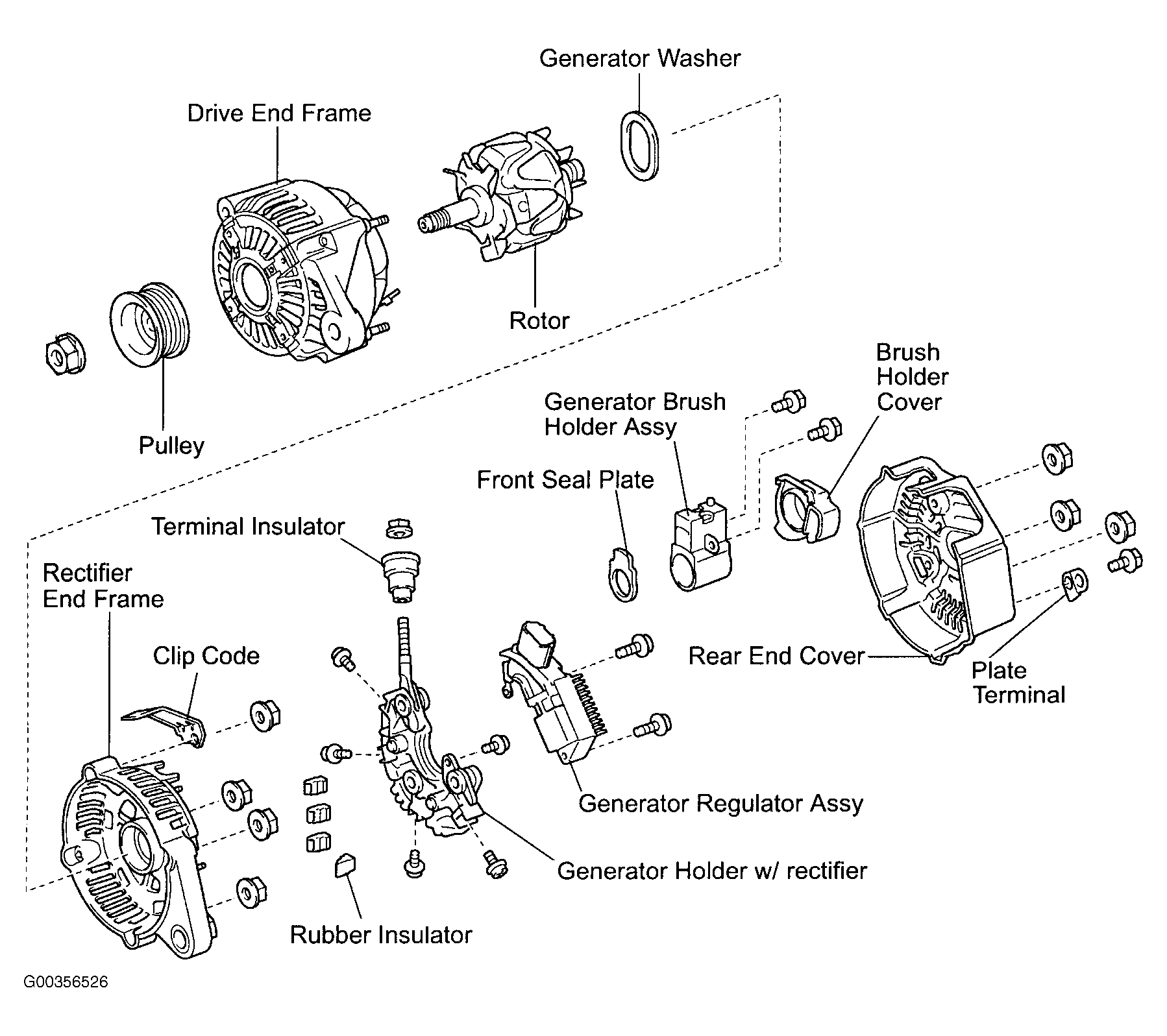 - Remove 4 rubber insulators from rectifier end frame. Remove generator seal plate from rotor. Remove 4 nuts and clip code. Using Bearing Puller (SST 09286-46011), remove rectifier end frame.