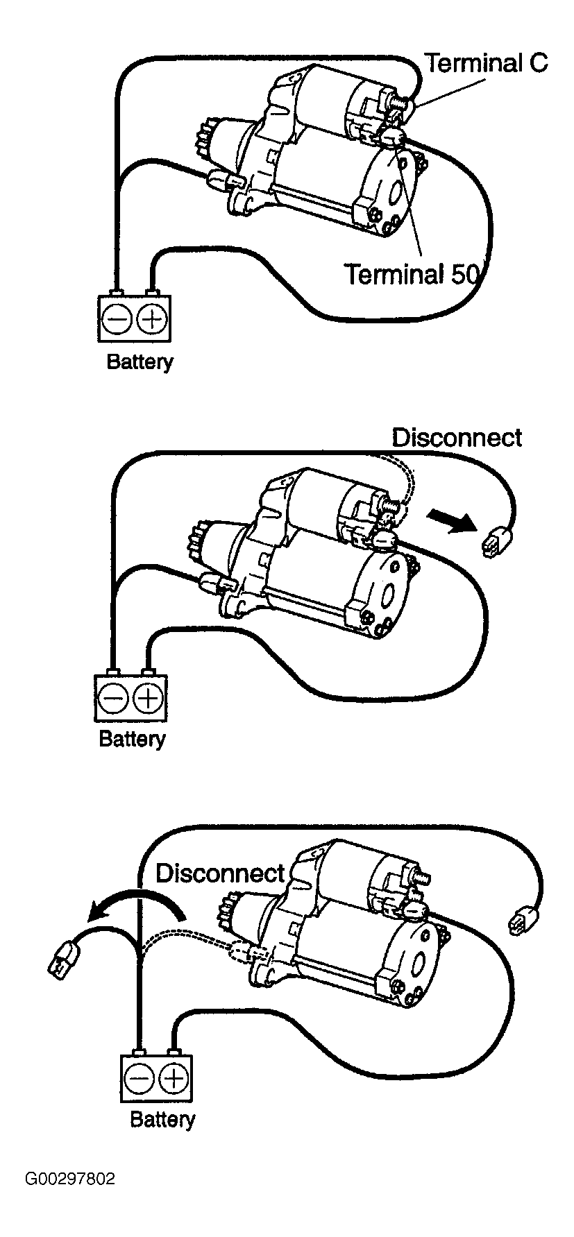 - Clip battery ground to terminal "C" and the main body of the starter, connect the battery positive to the magnetic switch (Terminal 50). Ensure that the clutch pinion gear moves outward. See Fig 1. If the clutch pinion gear does not move, replace the magnetic switch. If specifications are met, got to step 3.