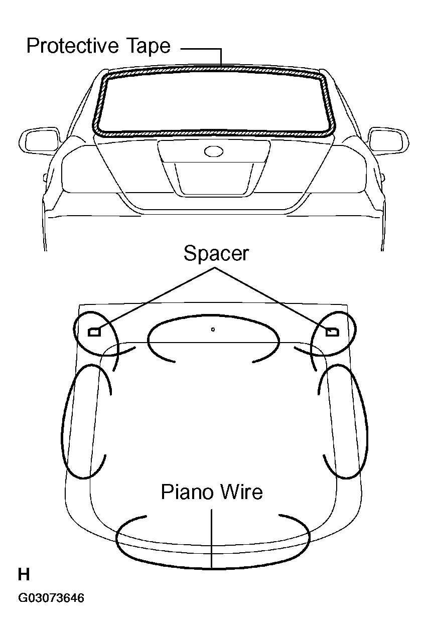 - Cut through the adhesive by pulling the piano wire around the glass.NOTE: Leave as much adhesive on the vehicle body as possible when cutting through the adhesive.