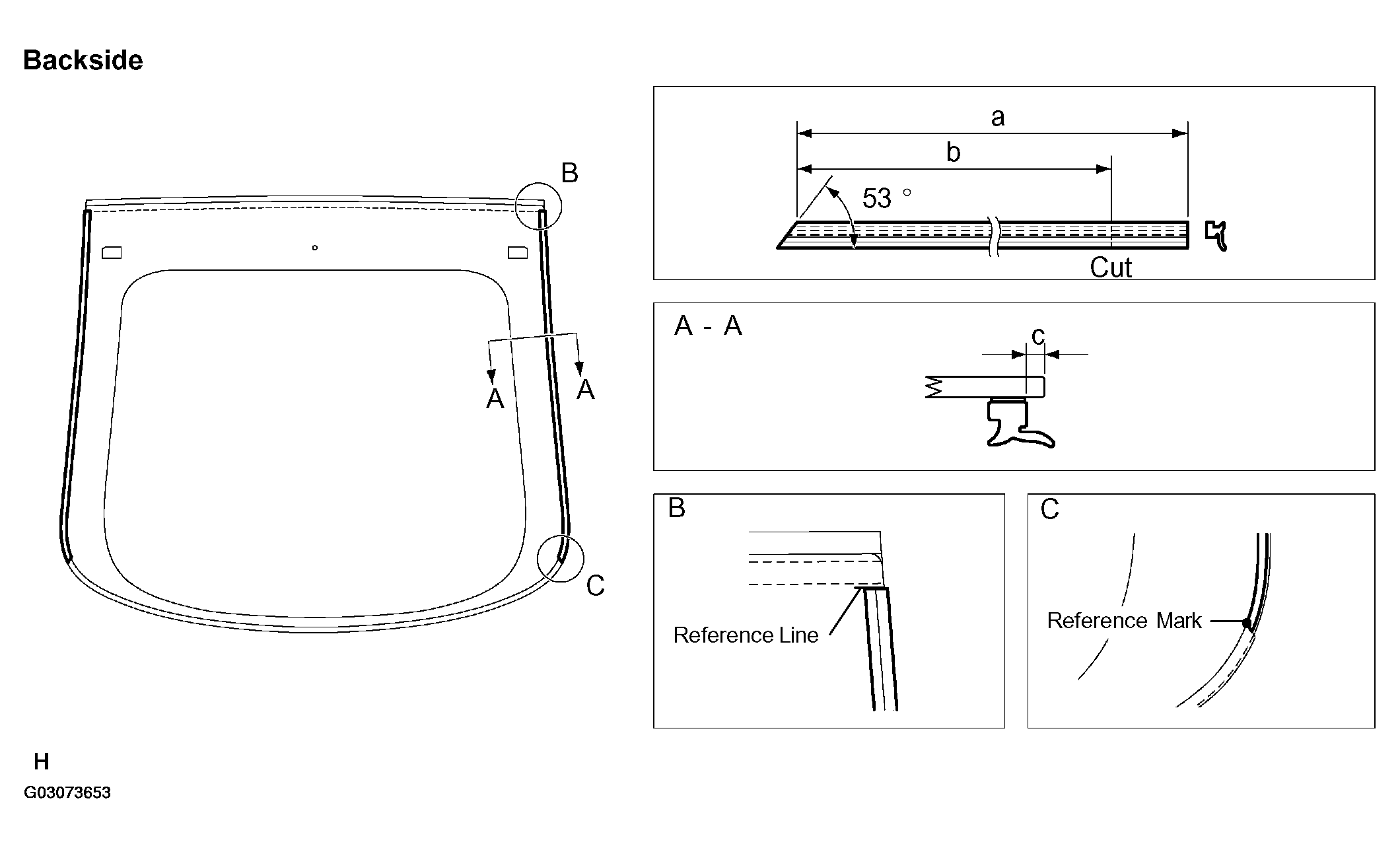 AREA MEASUREMENT SPECIFICATIONSArea Measurement a 12.0 mm (0.472 in.) b 8.0 mm (0.315 in.) c 85.6 mm (3.370 in.) - Install the back door glass to the vehicle body.