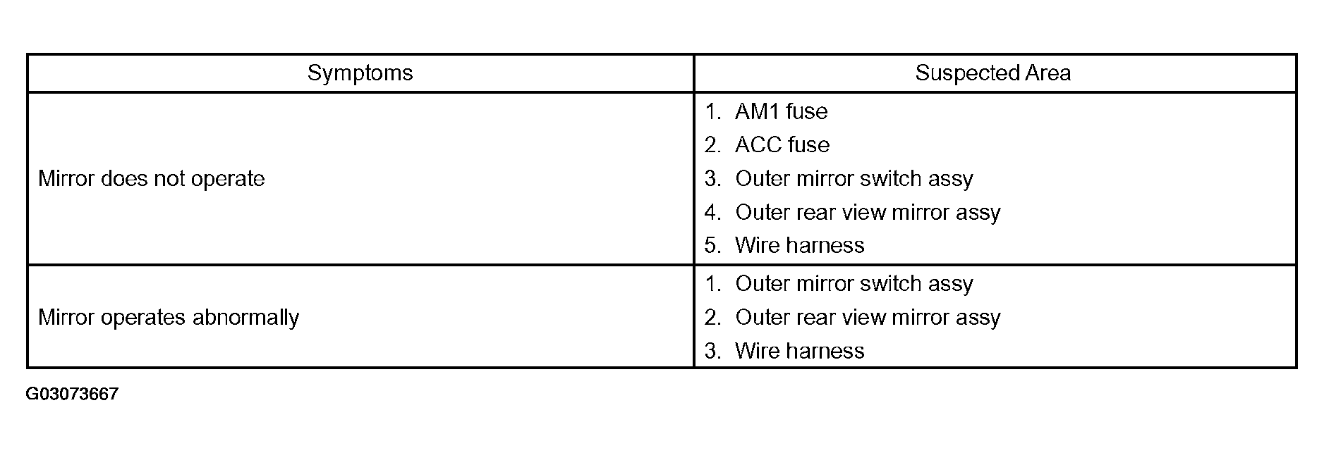 Use the table shown in Fig 1to help determine the cases of the problem symptom. The potential causes of the symptoms are listed in order of probability in the "Suspected Area" column of the table. Check each symptom by checking the suspected areas in order they are listed. Replace parts as necessary.