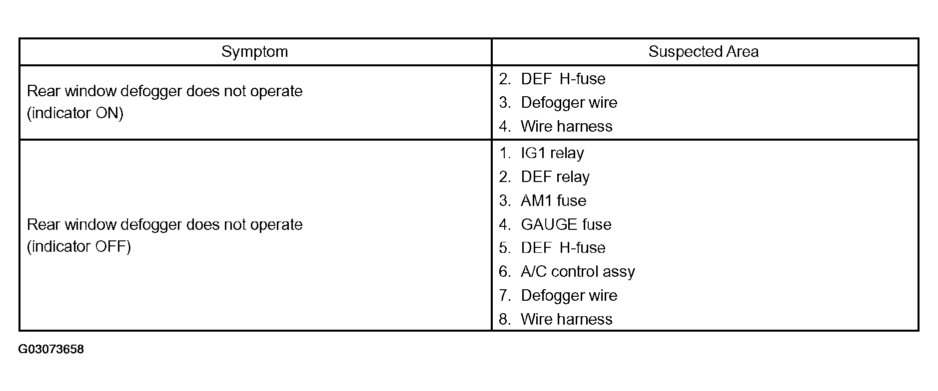 Home >> Scion >> 2005 >> tC Automatic >> Repair and Diagnosis >> Body & Frame >> Windows >> Windshield/WINDOWGLASS/Mirror >> Window Defogger System >> Problem Symptoms Table