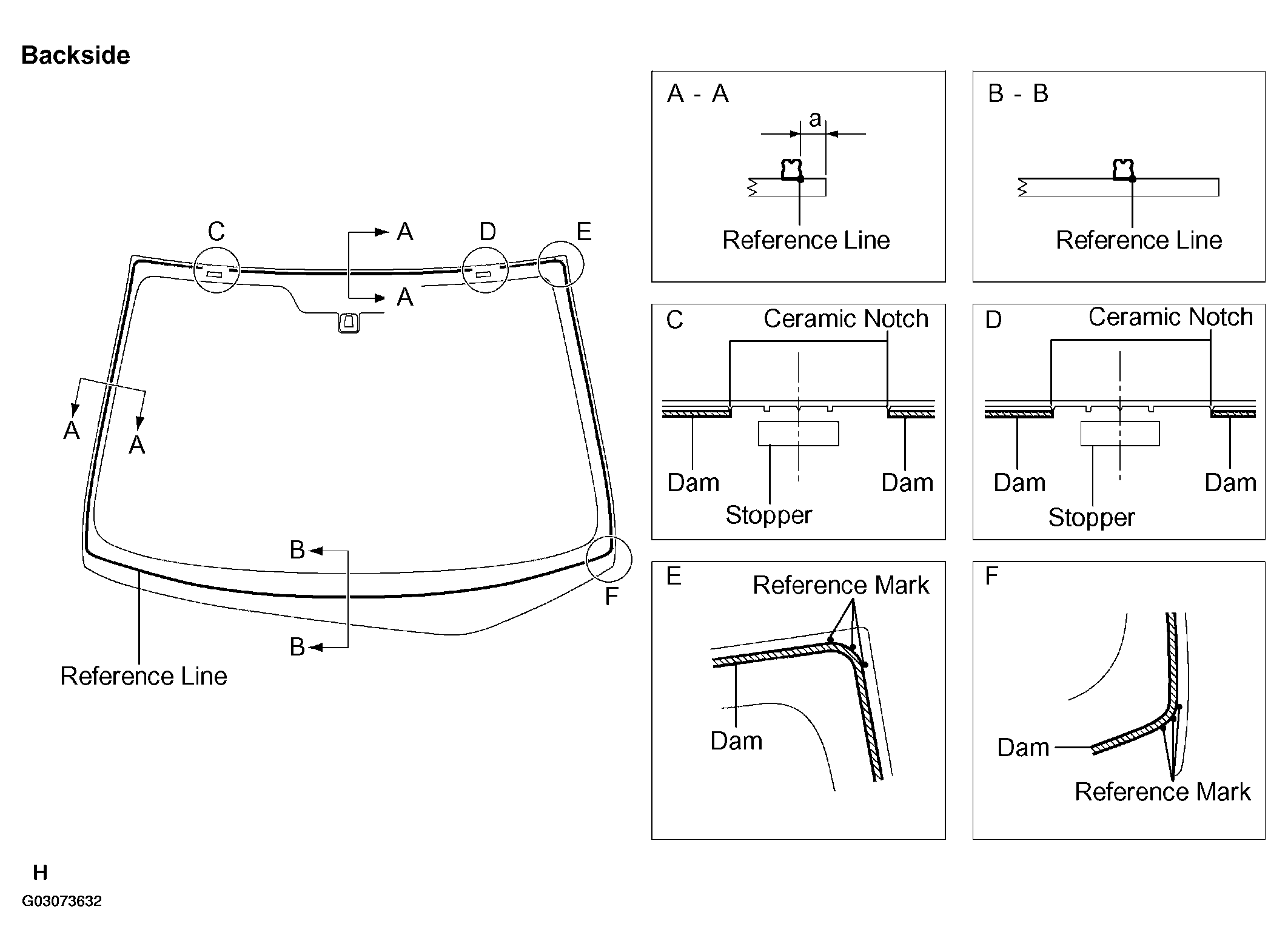 - Remove the peeling paper from the adhesive part of the dam. Install the dam (adhesive side) to the glass (Primer G area), but exclude the stopper areas C and D as shown in Fig 7