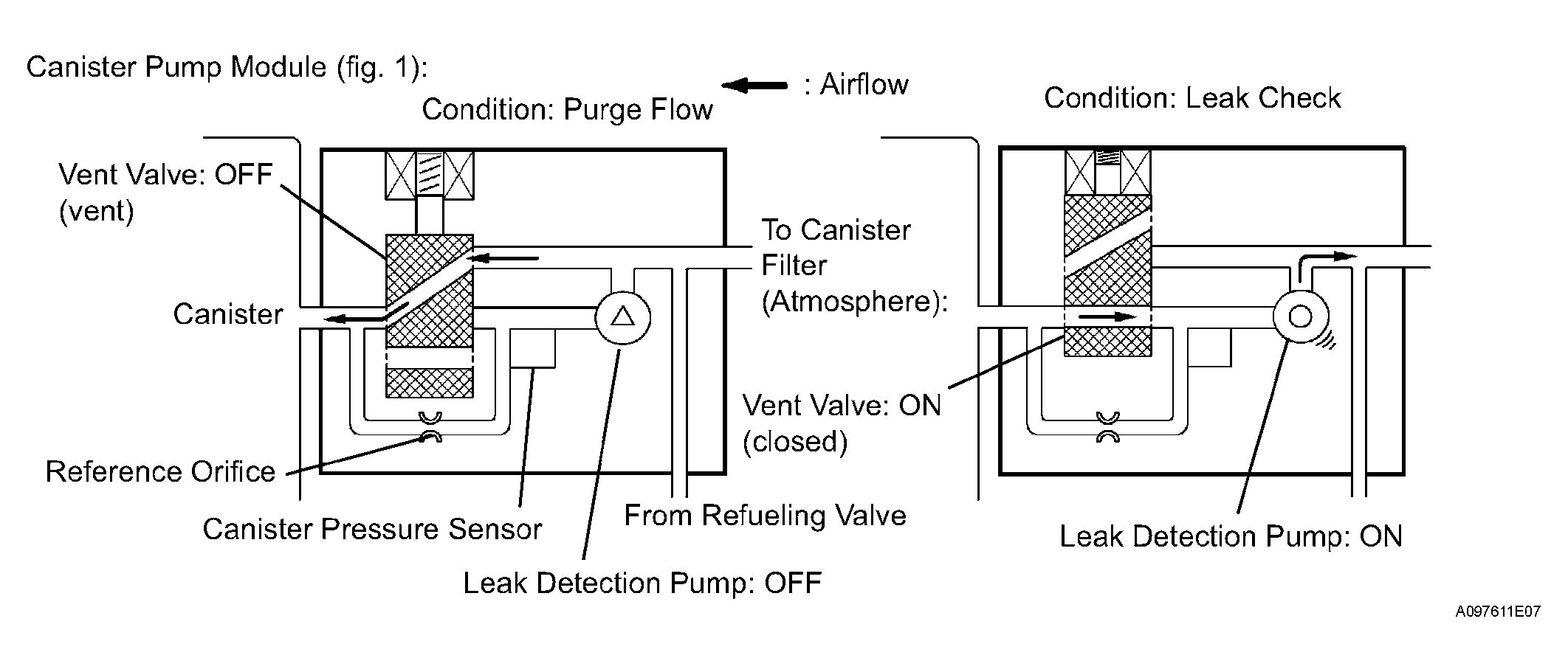The leak detection pump creates negative pressure (vacuum) in the EVAP system and the pressure is measured. Finally, the ECM monitors for leaks from the EVAP system and malfunctions in both the canister pump module and purge VSV, based on the EVAP pressure.