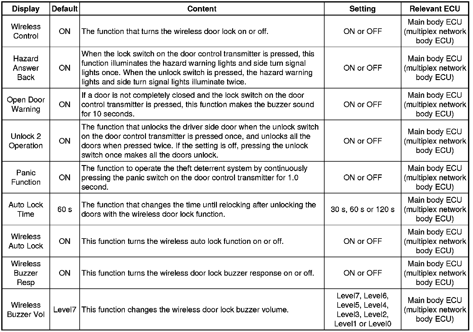 DOOR LOCK: WIRELESS DOOR LOCK CONTROL SYSTEM (W/O Smart Key System): CUSTOMIZE PARAMETERS