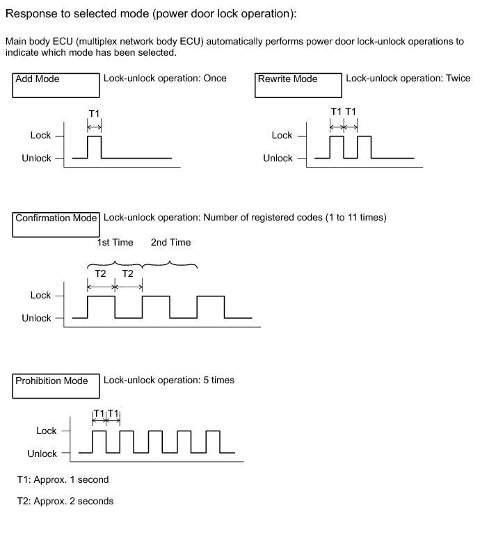 If the number of ignition switch ON - off operations is 0, 4, 6 or more, there will be no response (power door lock and unlock operation) to show which mode has been selected.