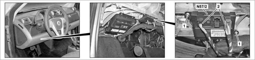 | Power Window Convenience Feature Control Unit (N57/2) | Left side of dash. See Figure. |