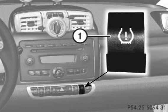The TPMS button in the cockpit switch panel is used to reactivate the TPM system. When the TPMS button is pressed the current tire pressure, as long as it is within permissible limits, is stored in the internal memory of the TPM [RDK] control unit and used as a reference pressure.