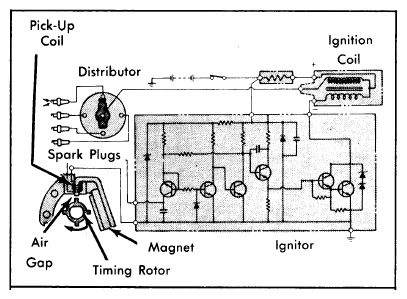 As the timing rotor turns with the distributor shaft, its teeth (one for each engine cylinder) pass the pick-up coil assembly. See Fig 1. As the air gap changes with the passing of the teeth, the magnetic field varies creating a signal in the pick-up coil assembly.