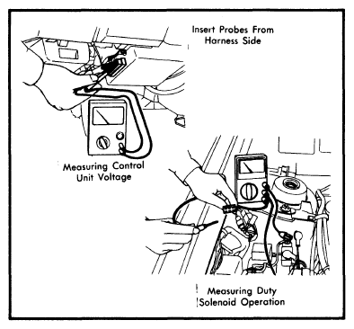 When checking resistance of components, be sure to disconnect all wiring harness connectors. When measuring voltage, connectors must remain hooked up. Be sure to insert test leads into harness side of connectors. See Fig 3.