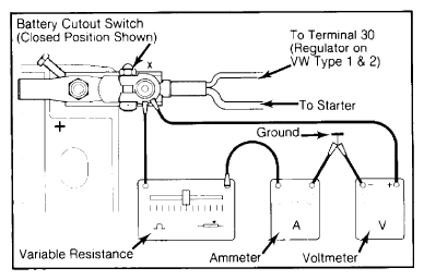 - Disconnect battery cables and install cutout switch, variable resistance, ammeter and voltmeter. See Fig 1. Connect ground cable and check that cutout switch is in closed position.